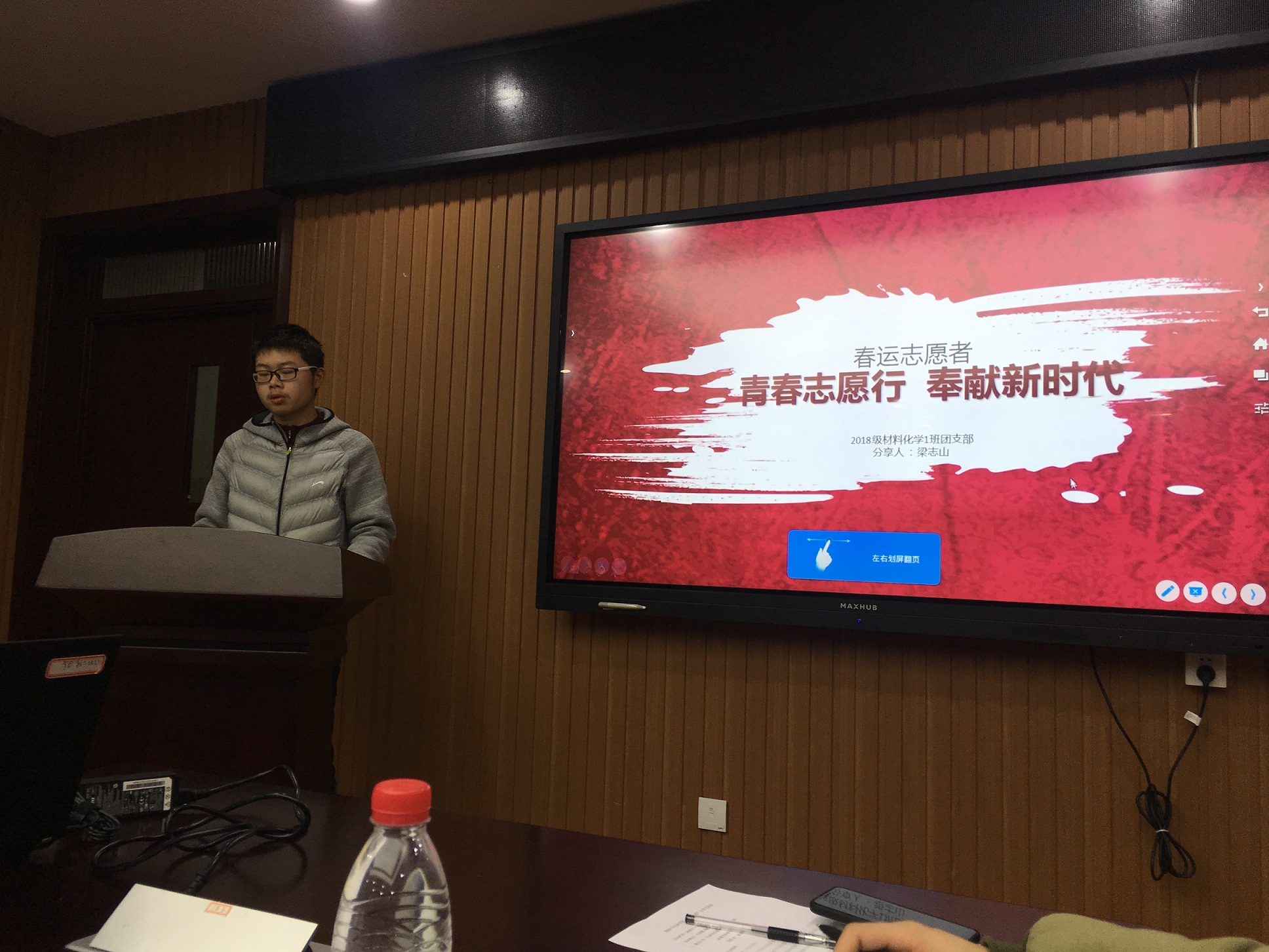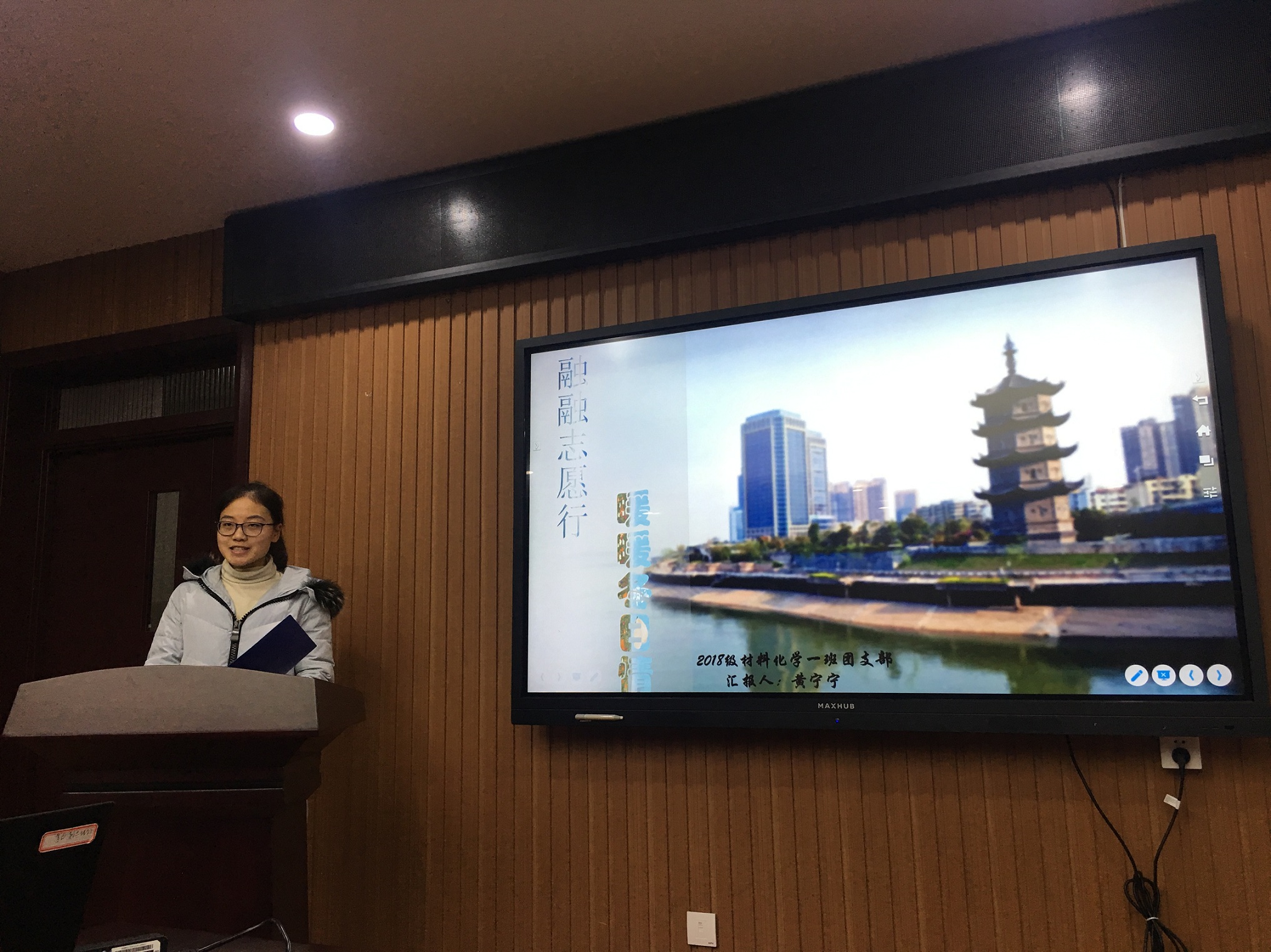 “乱花渐欲迷人眼”,百花逐绽竞争妍。3月4日,化学与材料科学学院于礼勤楼702组织召开了2019年寒假社会实践活动“我的暖冬故事”交流分享会。出席本次会议的有学院团委书记王国良、新生辅导员陶勇、院团委负责人刘健晨以及2017级与2018级各团支部社会实践队员代表,会议由2017级梅本星同学主持。在本次活动中,在团支书黄宁宁的带领下本班荣获最暖团支书的荣誉称号,而黄宁宁本人所在的团队也在本次活动中荣获“最暖先锋”的荣誉称号。
