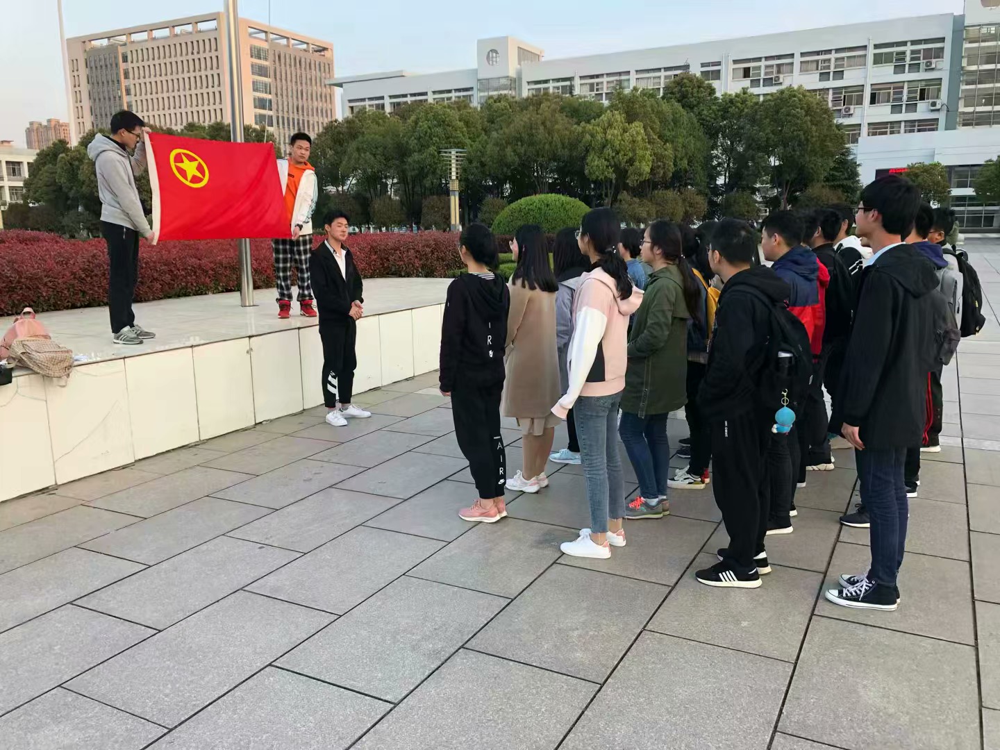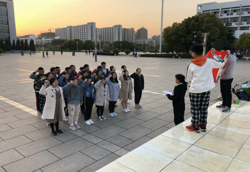 3月31日下午六点整,在安徽师范大学图书馆东门前广场上,材料化学二班的所有同学一起在国旗下开始了第二项活动。在团支书的带领下,大家齐唱国歌、背诵入团宣言,为的是回顾当时入团时的那份热诚,提醒大家做到心中有党。最后入党积极分子代表发表了他们的感想,希望所有同学能从新出发,也从心出发,做好自己。