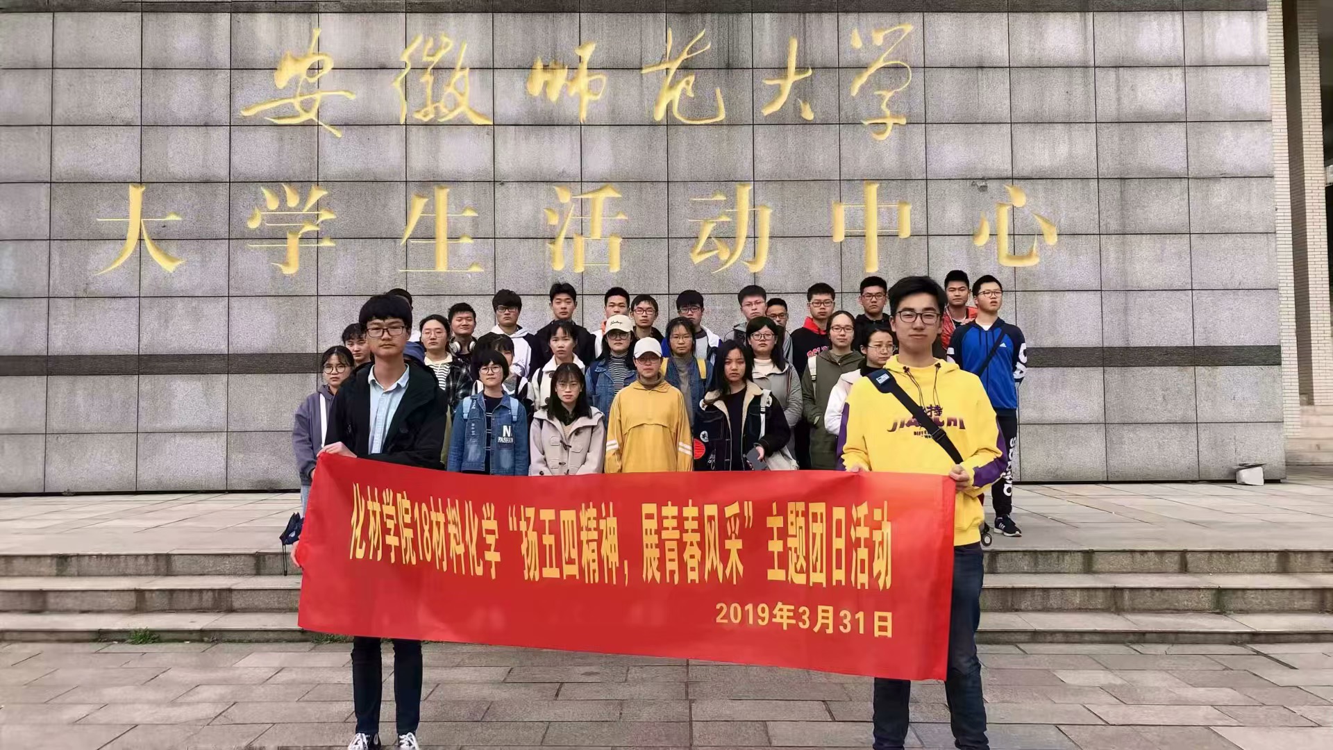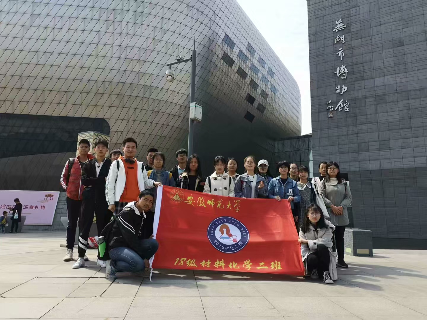 本网讯(18材料化学 王颖 郑瑶)伴随着和煦的春风,五四青年节也将到来,在院团委、辅导员老师的指导下,材料化学二班于3月29日组织了一场主题为“青春心向党,建功新时代”系列团建活动。本次活动由材料化学二班团支部组织,活动地点包括芜湖市博物馆、安徽师范大学图书馆东门前广场以及行知楼教室,材化二班同学全员积极参与了这次活动,用心感受了在中国共产党领导下发展的祖国。