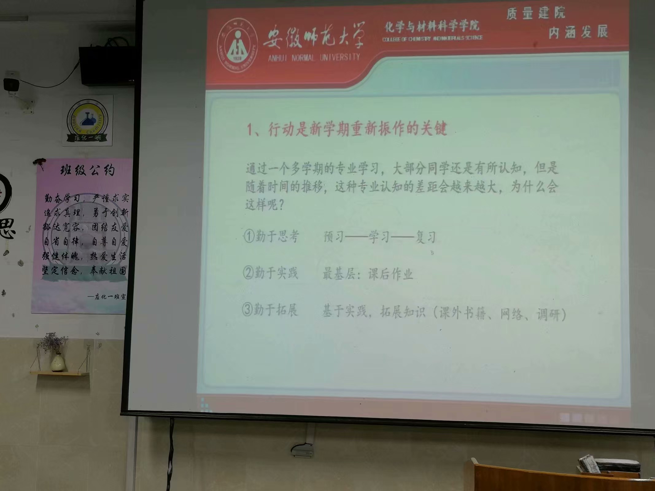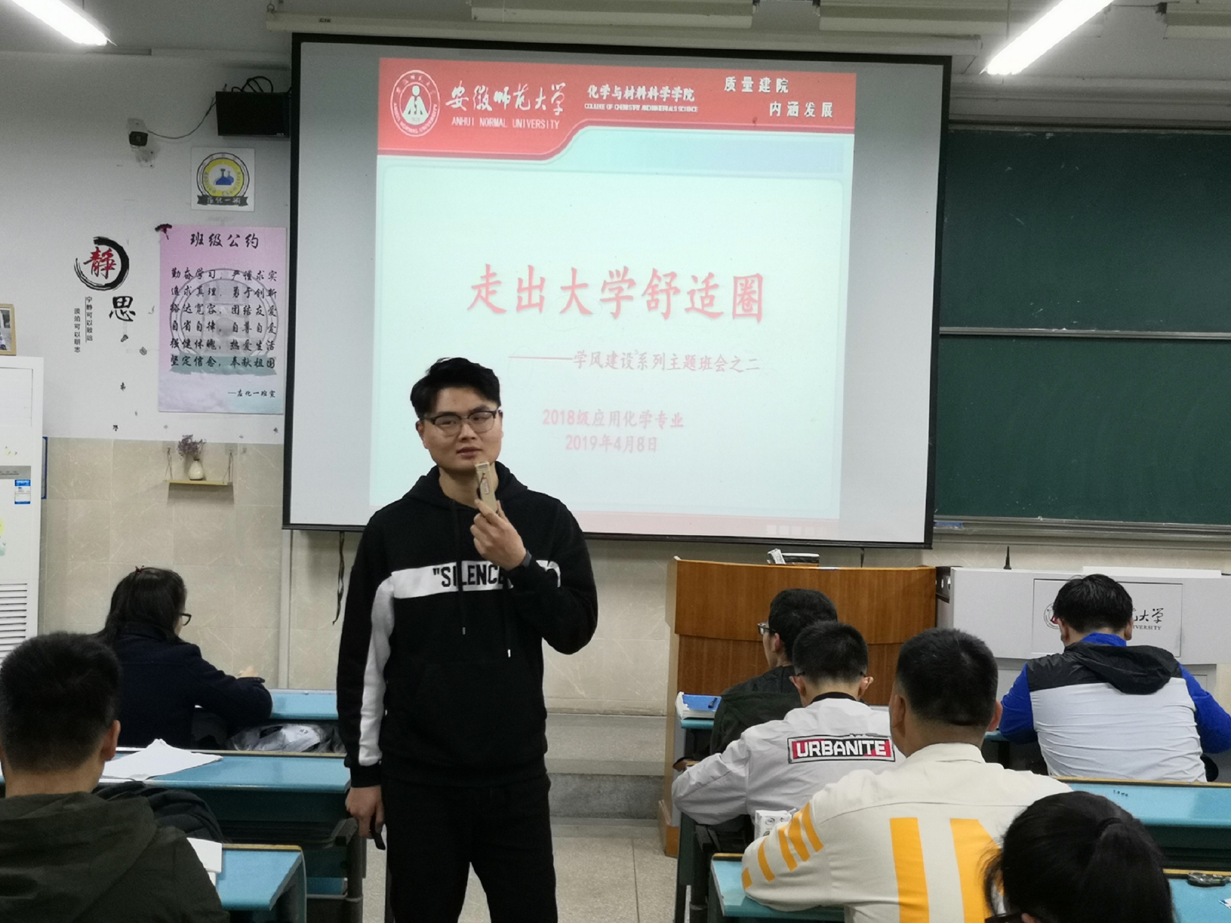 (本网讯 2018级应化二班 许楠楠)为解决前半学期班级学风方面所遇问题、提高学生学习自律意识,以最佳的状态准备即将到来的期中考试,2019年4月9日晚自习期间,辅导员陶勇为2018级应用化学专业全体同学开展了本学期第二次以学风建设为主题的班会。 班会开始,辅导员陶勇明确指出班级前半学期在学风方面存在的五大问题——手机管理、自习纪律、上课状态、单元考试、期中测试,以纪律问题为主要方面进行了规整教育,对同学们提出了严格要求,加强了对班级的管理力度。随后,辅导员结合了自身经历,以三句精炼的话语为同学们大学生活以及人生阅历方面进行积极引导:一、行动是新学期重新振作的关键;二、青春一大憾事,就是大一只有一次;三、你敢走出大学的舒适圈吗?总体氛围轻松,同学们也都纷纷表示赞同。 面对正值青春年岁的同学,辅导员引用了村上春树的一句:“我总以为18岁之后是19岁,19岁之后是18岁,20岁永远不会到来。”引发同学们响应,陆陈鑫同学表示:“最可怕的不是20岁在无声无息中弥漫在你的世界,而是你回望18岁和19岁确是一片空洞。”的确,我们正处于青春年少之时,也正是奋斗的开始,只有努力缩短前人与自己的距离,越早的开始意味着越快的超越,不能在这个本该朝气蓬勃的年龄选择安逸。 最后,辅导员就寝室安全问题进行了强调,深刻地告诫同学们宿舍查寝的必要性以及宿舍安全的重要性,同学们表示铭记于心并会积极重视。 一个优秀且成功的人,往往都是有超强意志力的人。因为他们有足够的意志去走出舒适区,他们有足够的恒心去实现自己的梦想,他们有足够的力量去迎接遇见的一切问题。一个人的成功,是从走出舒适区开始的,希望同学们在此次班会的交心之谈后,早日走出舒适区成就出最不平凡的那个自己。