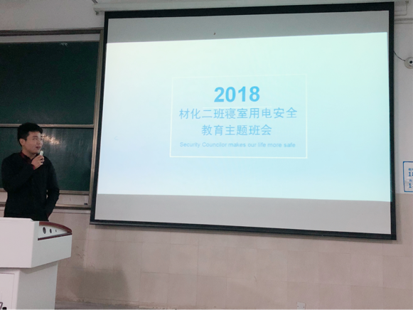 本网讯(2018级材料化学 朱莹珊)寝室用电人人有责,安全环境你我共创。2018年12月2日晚6点半,2018级材料化学2班在行知楼2030403教室召开了冬季寝室安全教育主题班会,参加教育班会的有18级材料化学二班全体同学,本次班会由安全委员武凯主持并进行PPT展示,旨在加强班级同学用电安全防范意识,保障同学安全。