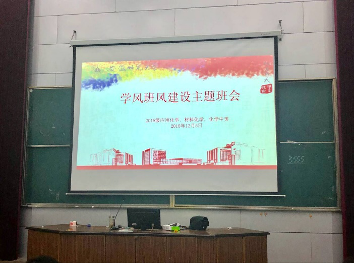 本网讯(18材料化学 严殊颜)12月5日晚上7点,材料化学、应用化学、化学中外三个专业的同学在2010105教室开展有关班级班风建设和期中总结的主题班会,本次班会由辅导员陶勇主讲。