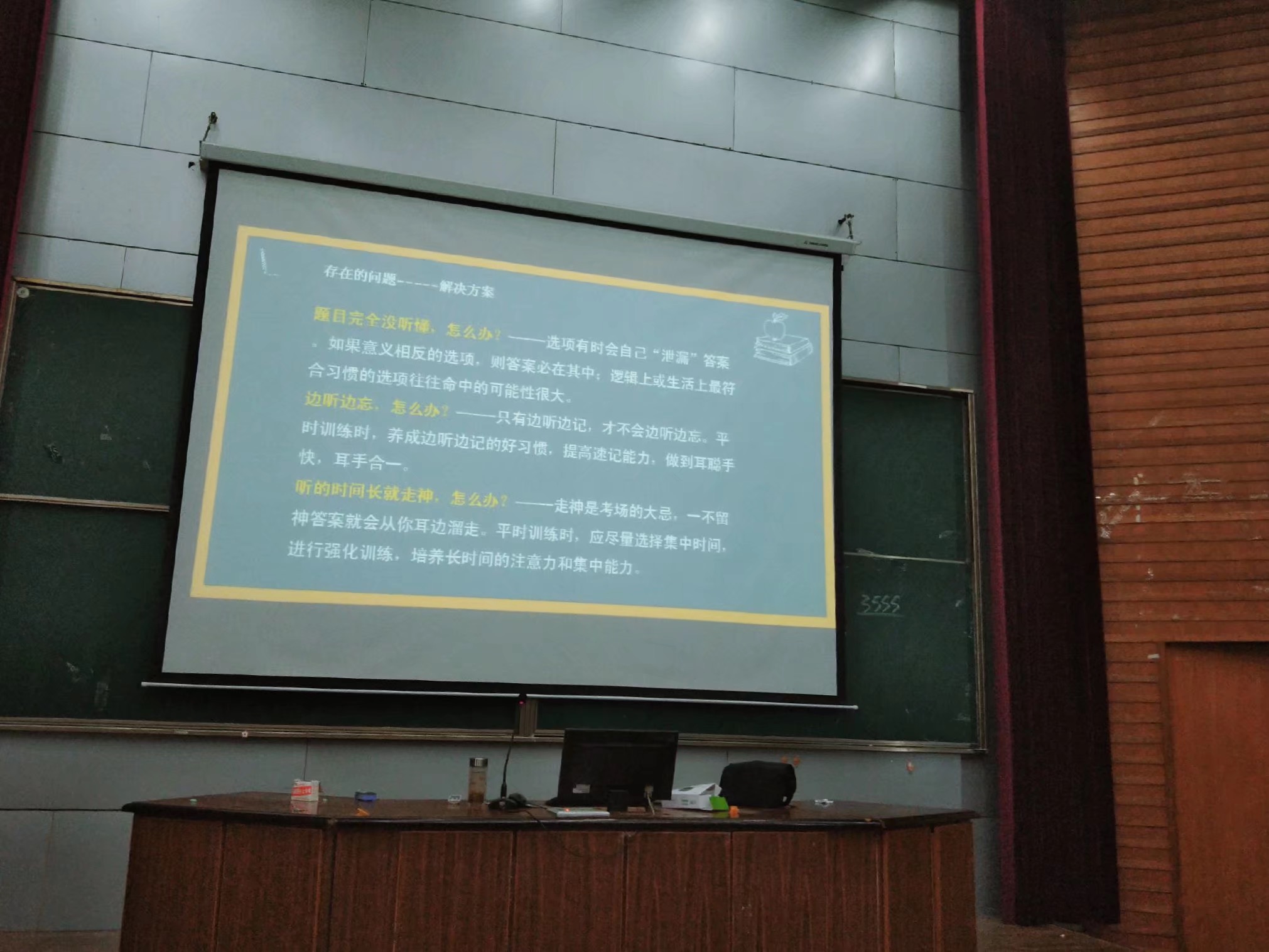 针对四级考试的题型,导员从听力、阅读、翻译、作文三个方面分析了相关的做题技巧。听力部分强调了对于单词发音的掌握,建议同学将一套听力试题听上三遍从而提高听力技能。对于阅读部分,导员介绍了三种题型它们各自的解题技巧。说到翻译和作文部分,导员建议同学们注意积累,注意长短句的使用,多使用高级表达。