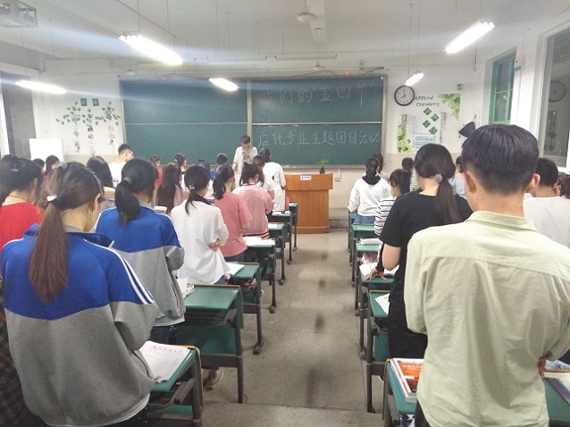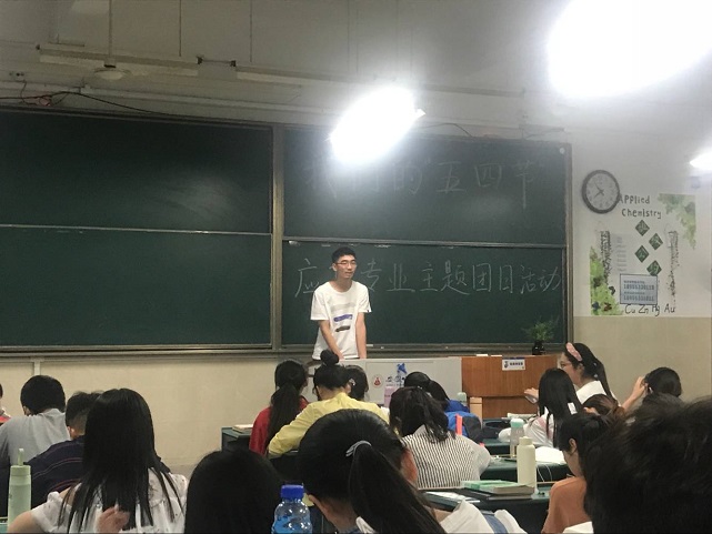(文:马梦悦 图:王若馨)为弘扬五四精神,牢记青年使命,5月3日晚,17级应用化学专业全体学生在行知楼2010504教室开展了“我们的五四节”主题团日活动。活动由应化1班团支书裘忆主持。