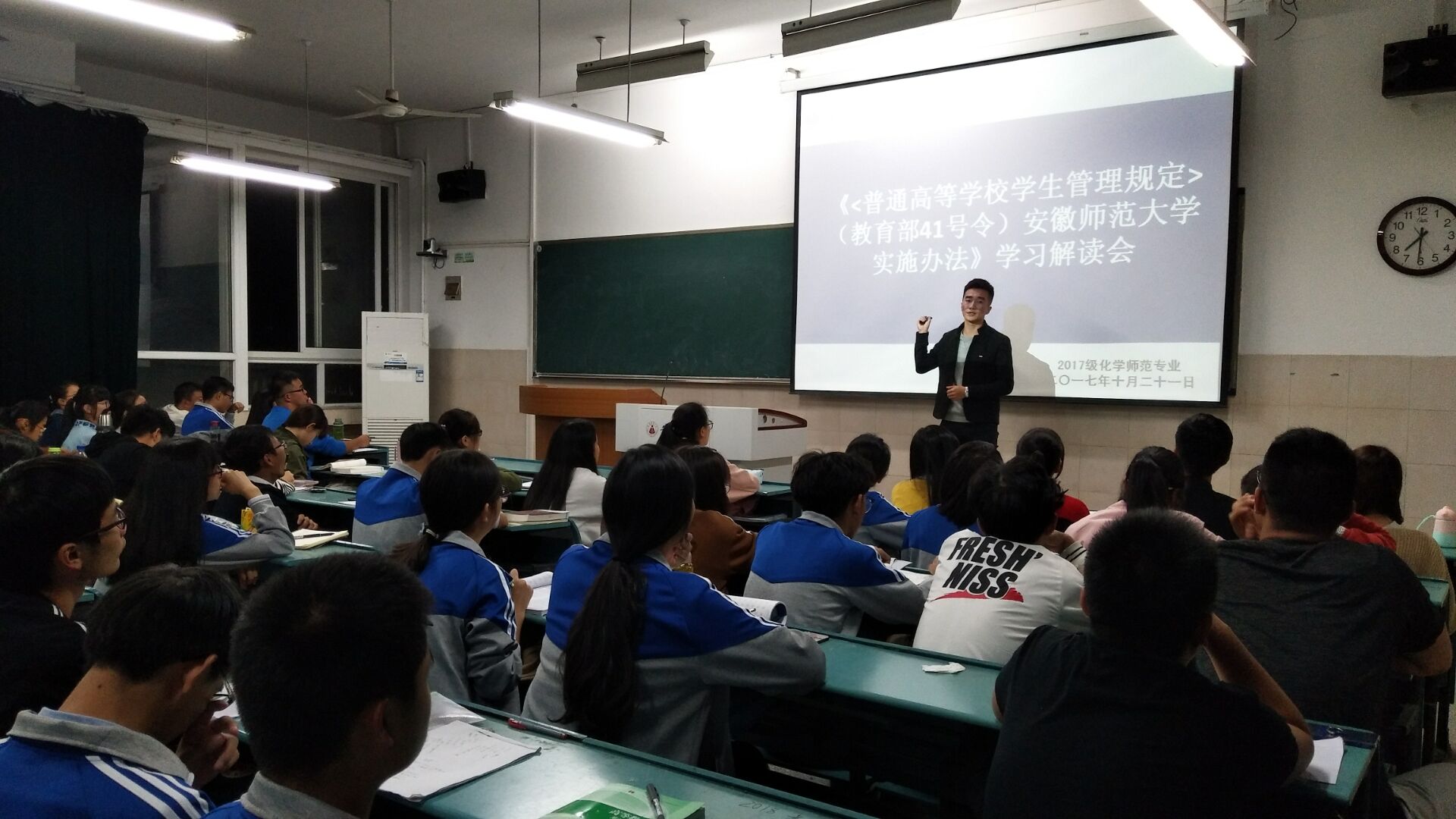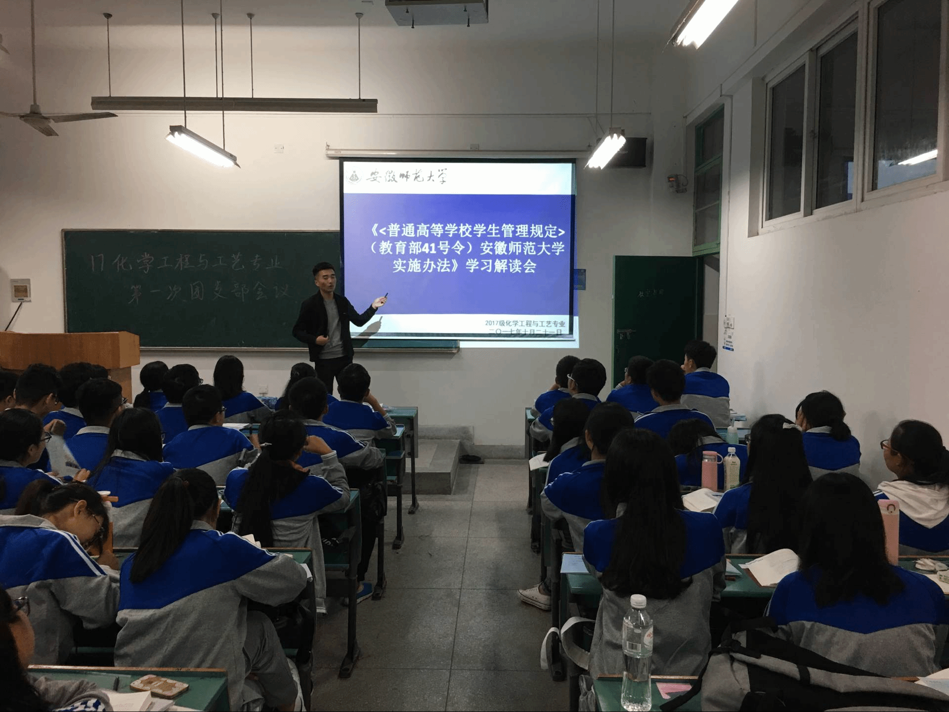 本网讯(2017级化工 方子妍)10月22日晚,在班级辅导员王雨兵的组织下,2017级化学师范与化学工程与工艺专业召开了关于《< 普通高等学校学生管理规定>(教育部41号令)安徽师范大学实施办法》的学习解读会,此次学习解读会极具教育意义。