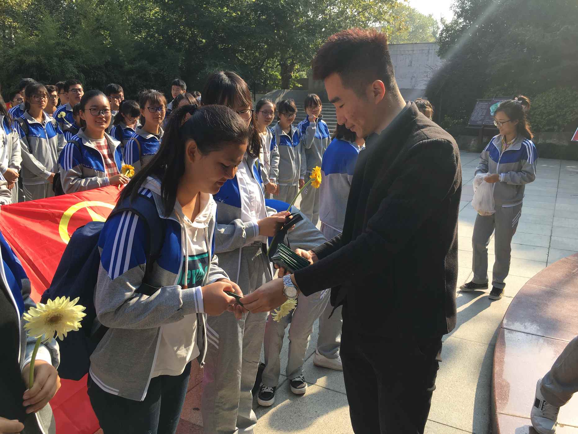 经过半个多小时的车程,大家来到了王稼祥纪念馆。在耀眼的日光下,烈士王稼祥的雕像显得尤为高大庄重,本次仪式由团支书吴飞同学主持。仪式第一项,由辅导员老师发言。王老师强调此次活动旨在缅怀先烈,牢记历史,让同学们学会珍惜当下美好的生活,肩负起时代赋予我们青年的责任,做一名合格的共青团员。同学们认真聆听,深受鼓舞。仪式第二项,团支书吴飞同学带领大家重温入团宣誓词,一字一句,掷地有声,展现师大学子良好的精神风貌和充满朝气的青春形象。仪式第三项,吴飞同学向全体同学一一发放团徽,颁发团员证,让同学们再次深知肩上沉甸甸的责任,体会到作为一名共青团员的使命感。仪式第四项,为烈士王稼祥献花。辅导员王老师首先做出表率,带领大家献上表达追思与敬意的菊花,缅怀先烈为我们和平生活做出的巨大贡献。仪式第五项,团支书和四名团小组组长领唱团歌《光荣啊,中国共青团》,悠扬有力的歌声久久回荡在天际,响遏行云。
