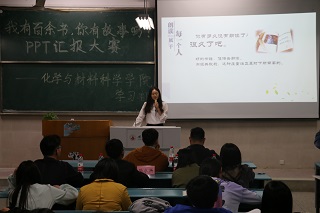 5月8日晚上7点半,学院在行知楼2030203首先举行了“我有百余书,你有故事吗”PPT汇报大赛决赛,院团委书记王国良、18级辅导员程紫丹、学生会主席团成员以及篮球比分手机 部分学生代表应邀观看了本次比赛。比赛以PPT汇报的形式展开,比赛中,参赛选手向现场的评委观众推送了自己喜爱的书籍,有耳熟能详的经典小说《围城》,有记录三毛青春岁月的《雨季不再来》,有文字唯美、意境清远、情感深沉的《青铜葵花》,17化师尹雪儿更是结合《朗读者》以个人情感体验与作品结合的方式,以现场朗读的形式为观众带来了一段精彩的读书分享……最后,评委王国良、程紫丹老师分别做了总结分享,王国良老师代表学院为大家提供了读书福利,承诺将依据同学需求扩大读书角的规模;程紫丹老师则是从专业的角度鼓励理科生勤与书籍对话、与作者对话、与思想对话,养成良好的读书习惯。