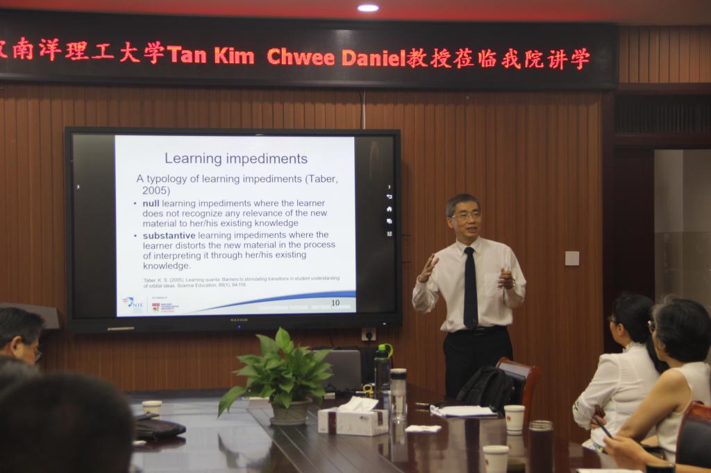 Tan Kim Chwee Daniel副教授作了题为“Web-based Diagnostic Assessment”的学术报告。报告分别从学习障碍、双层选择题、基于网络的评估和总结这四个方面来展开。Tan Kim Chwee Daniel副教授首先介绍了什么是学习障碍、如何划分学习障碍。接下来引出双层选择题的起源和应用,并以Google form为例演示了基于网络的诊断性评估,然后对学生的学习障碍,双层多项选择问题,基于网络评价所取得的成就和挑战等内容展开了生动和专业的论述,接着总结了基于网络的诊断性评价教育取得的重要成绩:它在一些特定问题取得了有效的解决方法,它对于一个问题可以有更多的解释,它减轻了管理、校对,特别是教师工作的负担。会后,Tan Kim Chwee Daniel副教授就本次报告内容与在座师生进行了热烈的互动交流。
