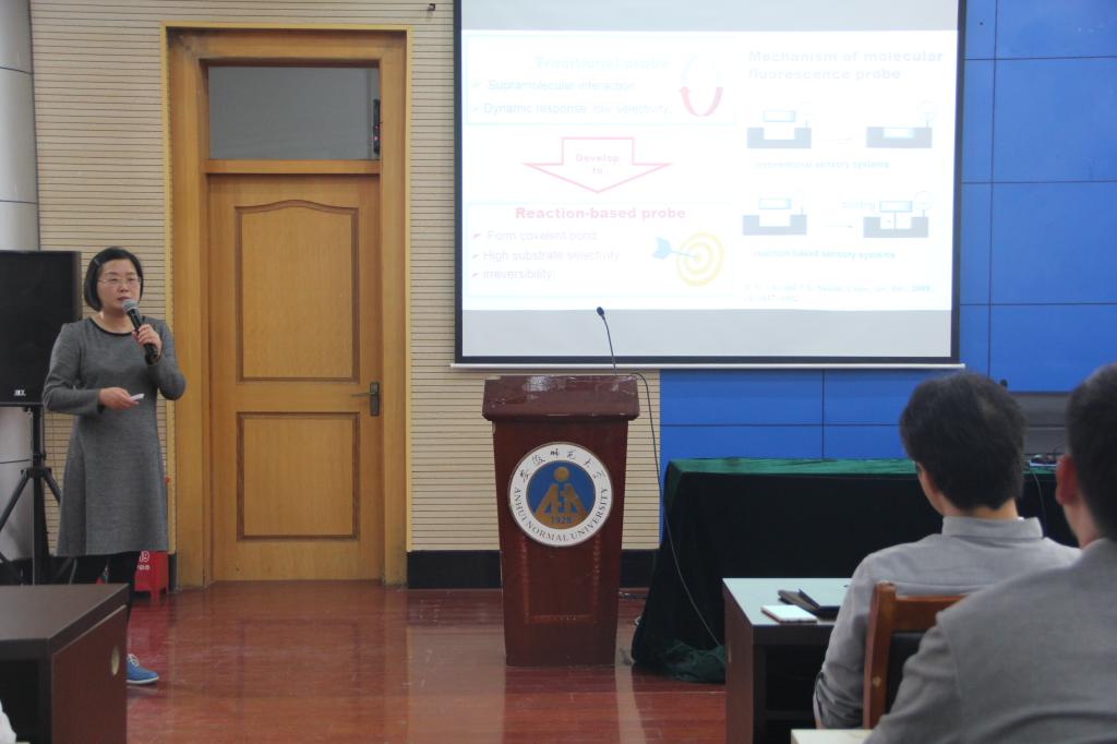 此次论坛上,日本爱媛大学副校长Uno Hidemitsu教授、香港中文大学的陈建成教授、南京大学的沈珍教授和何卫江教授分别作了题为“Preparation and Properties of Benzene-embedded Doubly N-confused Porphyrins”、“Catalytic Hydrogenolysis of Carbon Carbon Single Bonds with Water”、“Reaction-based Dynamic Sensing”和“Organic Chromophores and Their Applications in Living Systems”的大会邀请报告。来自杭州师范大学的周志宽和盖立志副研究员、我校夏云生和焦莉娟教授和日本爱媛大学的交换博士生Kohta Muramatsu分别作了论坛交流报告。交流研讨阶段,与会专家围绕相关研究领域、科研动态开展了充分的交流与研讨。