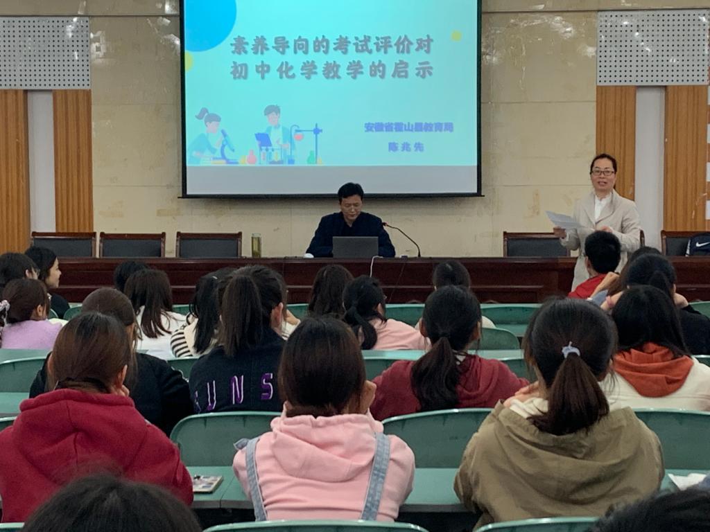 邀请安徽省特级教师、安徽省正高级教师、霍山县教研室主任、中学化学教研员陈兆先来院作题为《素养导向的考试评价对初中化学教学的启示》的主题报告,这是2021年“中学化学名师讲坛”系列活动的第四讲,报告会在花津校区财务处二楼报告厅举行。2019、2020级化学专业师范生及部分化学教学论专业研究生和教师参加了此次报告。