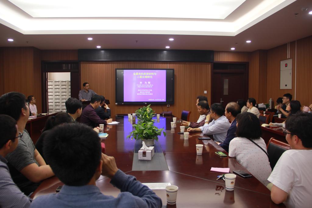 孙为银教授作了题为“金属有机框架材料与CO2转化”的学术报告。孙教授主要从光催化二氧化碳和电催化二氧化碳两个方面进行讲授。光催化方面主要介绍了几类不同的MOFs,如NH2-MIL-53(Fe),NH2-MIL-88(Fe),NH2-MIL-101(Fe),Pt@NH2-UIO-68。由于它们的配体不同,导致它们的性能也有很大的不同。尤其强调了负载不同MOFs比例纳米立方体光催化还原二氧化碳的效果是不一样的。电催化方面,热解含不同比例镍卟啉配体的PCN-222得到系列Nin-N-C材料,其中Ni20-N-C具有最好的二氧化碳电还原性能,FLco高达97%以上。最后还介绍了高效经济二氧化碳-氯碱共电池体系、电催化还原二氧化碳到乙烯等。会后,孙教授强调做科研一定要耐得住寂寞,在做科研的道路上,有很多不懂的地方一定要认真克服,不能畏难。通过不断的学习来积累经验。