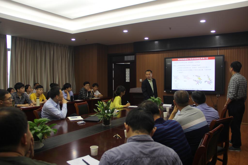 赵建章教授作了题为“新型三重态光敏剂的研究”的学术报告。赵教授首先简要介绍了新型三重态光敏剂具有的两大重要特点:强可见光吸收、长三重态寿命,以及其课题组成员在系间窜越新机理的探索:自由基引起的系间窜越和电荷引起的系间窜越,以及长寿命电荷分离态的研究。随后详细讲解了三重态光敏剂的特点、领域、优点及研究手段与仪器设备等研究现状,针对已有现状的缺点及不足展开新的研究内容展示。三重态在泯灭转化上有着显著特点:上转换效率高、化合物可选范围很宽、激光发射波长灵活可调。有机光敏剂激发波长可测,可用于三重态泯灭的转化两部分性质;两部分性质优势互补,可得到更多不同结构的三重态光敏剂。最后阐述了预期的新概念,宽谱带吸收剂转变为三重态光敏剂的预想。会后,赵教授就与会师生提出的问题进行了详细解答。