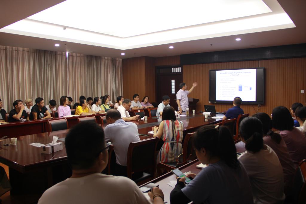鲁希华博士作了题为“Controlled Syntheses and Self-assembly of Smart Nanogels”的学术报告。鲁博士首先介绍了智能纳米凝胶技术,智能凝胶是凝胶的一种。凝胶是吸收了液体介质的三维高分子聚合物,能够与外界进行能量和物质的交换,具有吸收性和缓释性。智能凝胶是一类能对外界刺激(如温度、pH值、光、压力、化学物质等)产生敏感响应的材料,是目前具有良好应用前景的一种化学材料。接着介绍了水凝胶的一些应用,由于其亲水性和血液相容性,是一种良好的医疗材料。随后阐述了常规聚合物胶体晶体:硬纳米球PMMA或PS在有机溶剂中的自组装,并且指出其缺点:需要有机溶剂,对外界刺激很少或无反应,机械强度低或无。最后鲁博士总结了新型水凝胶蛋白石的科学影响及应用前景,指出C&E News & Technology浓缩技术,与传统的胶体晶体阵列相比,凝胶的快速响应率可能是开发传感器或显示技术的一个主要优势。