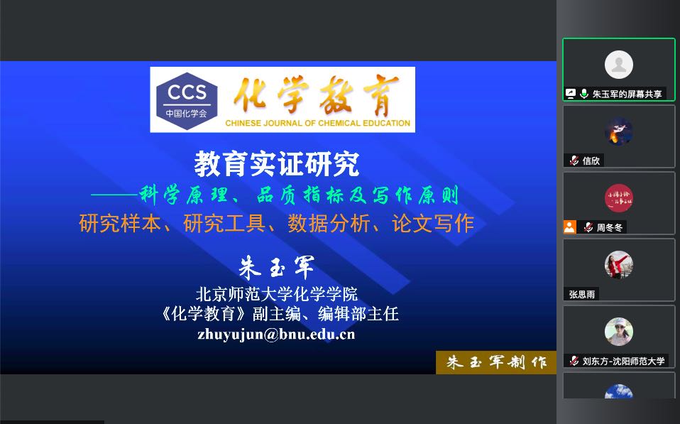 朱玉军首先介绍实证研究学习的重要性,指出当前存在的许多实证研究论文其方法都是不严谨的、研究的质量很低。他通过案例分析,总结了目前教育实证研究的现实困境。随后,他从文献综述、样本选择、数据收集、数据处理、评分标准、评分结果等方面强调教育研究的科学原理,补充了教育课题研究的相关要素和常见分类。最后,他通过生动案例和论文分析讲述提倡实证研究的原因。讲座内容精彩实用,发人深省,给化学师范生和相关方向研究生的专业成长提供了非常有用的建议和指导。
