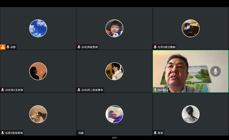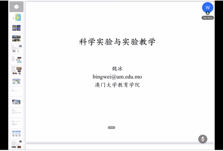 田旭)2022年11月28日下午,在2020级《化学教学技能研究与训练》的课堂上,澳门大学教育学院魏冰教授与化学教学论教研室的所有任课教师为2020级化学师范生和化学教学论研究生在线上共同开展了一堂跨越空间的开阔国际视野的实践教学课。本次活动也是我院“国际教育万花筒”活动的第一讲,由化学教学论专业教师孙影教授主持。