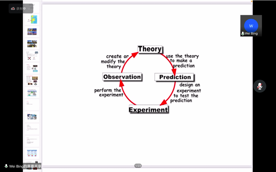 本次活动的第二个环节,由魏冰教授为师生作“科学实验与实验教学”为主题的学术报告。讲座开始,魏教授为大家介绍了澳门大学的地理位置、学校概况和教育情况,欢迎同学们未来考研选择澳大。之后魏教授通过实验广义和狭义的定义展开,介绍了实验与理论的关系,化学实验在课程标准中的发展,围绕实验教学进行了深入的阐述,使同学们受益匪浅。最后,魏冰教授通过课题组发表的一系列英文文章,带领同学们从国际的视角审视化学实验及实验教学研究,为大家的研究选题指引了方向。随后讲座进入互动环节,在魏冰教授引导下,老师和同学积极提问,魏教授耐心地为大家进行解答。
