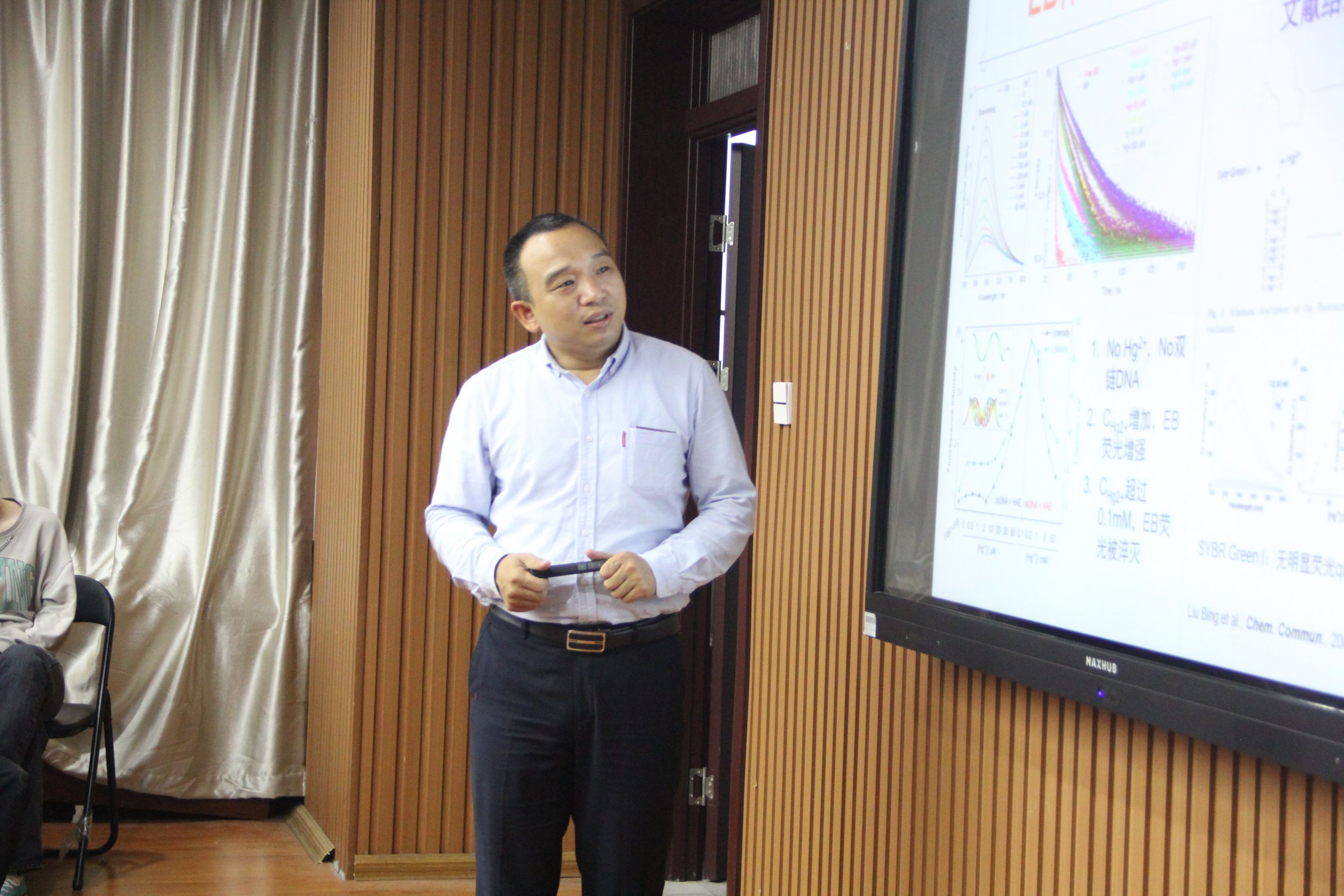 吴鹏教授作了题为“磷光分析之DNA链内重原子效应的发现”的学术报告。吴教授首先介绍了课题的由来与创新性的发现,即从实验现象出发,实现了选择性的HAE。而后,通过理论计算与实验分析,发现选择性HAE可促进高灵敏磷光分析。并对其可能的应用领域进行了探索。会后,吴教授对与会师生提出的相关专业问题进行了详细的解答。
