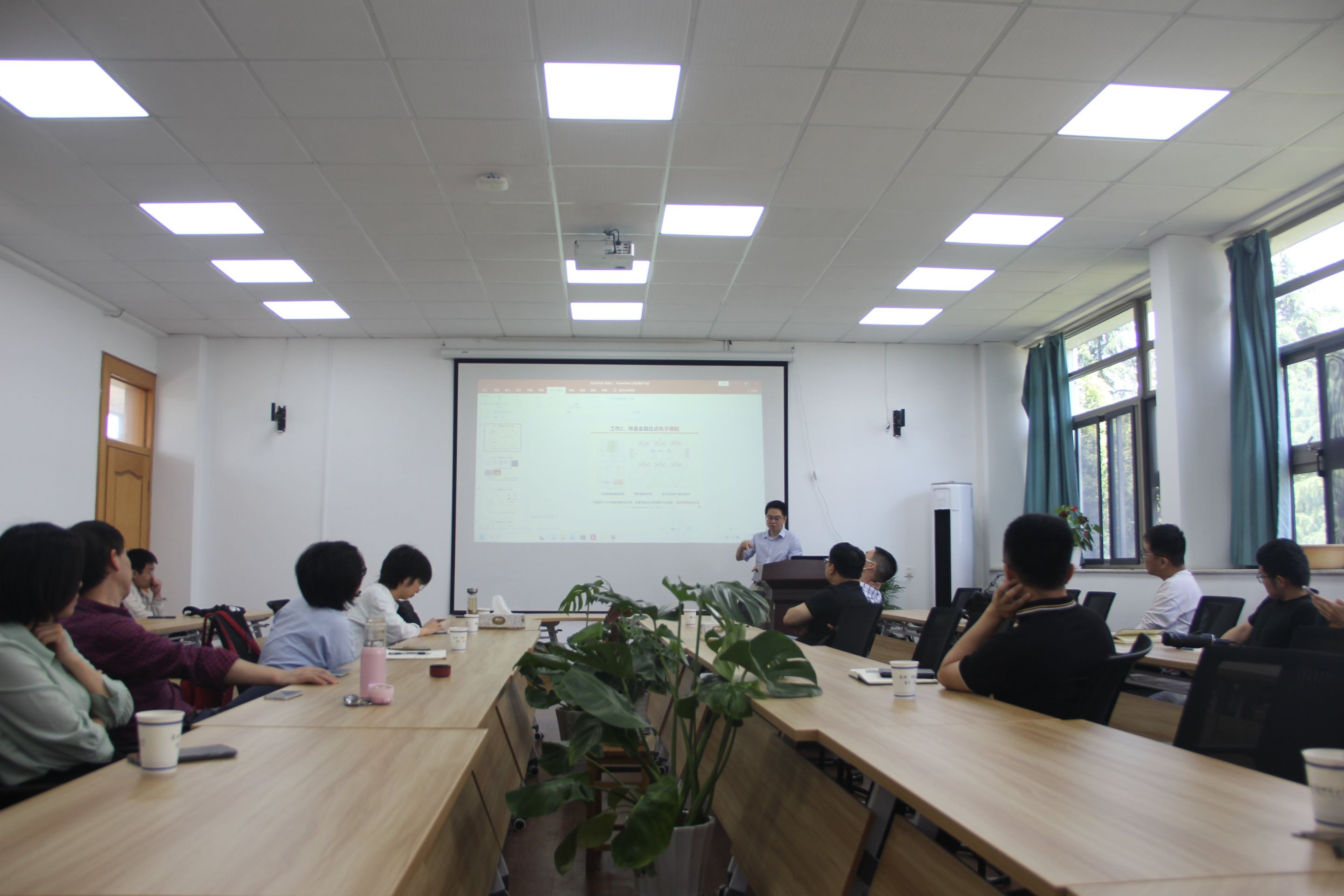 彭生杰教授作了题为“金属中心的局域结构调控及能源转化与储存研究” 的学术报告。彭教授首先介绍了界面金属位点的动态演变。针对界面金属位点配位结构转变后,是否能有效维持界面相互作用展开讨论,从配位转变促进界面金量Co位点电子结构优化、配位转变后的电信化制可实现大电流座度高效折氛、亲水疏气表面大电流密度疏氢、将重构催化剂应用于电解海水制氢、中性与碱性海水中均表现出良好的催化活性、碱性与中性海水中可维持长时间稳定性等方面进行了阐述。随后,彭教授进一步介绍了界面金属位点电子调制、界面金属位点键合效应和单原子金属位点的配位调节等内容。会后,彭教授就报告内容与与会师生进行了交流,回答了师生提出的问题。