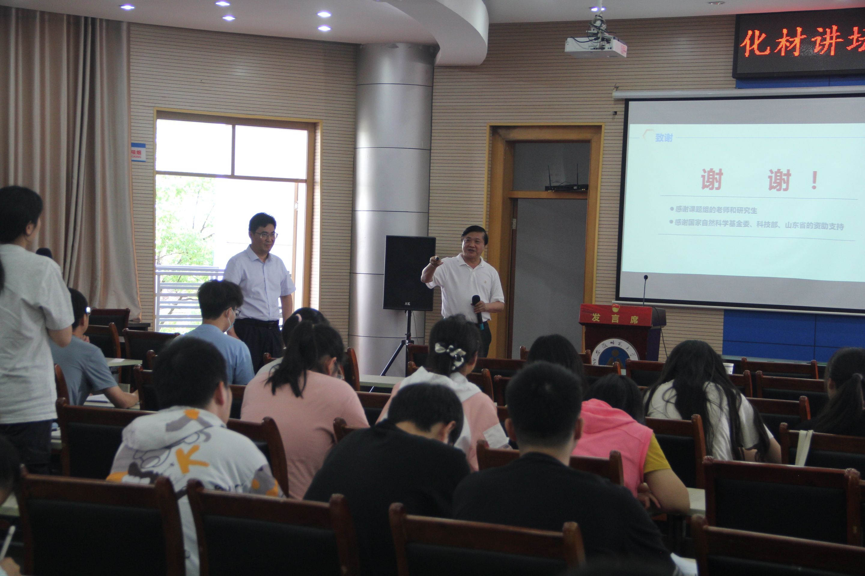 唐波教授作了题为“氧化应激相关疾病演进的细胞、活体分子荧光成像”的学术报告。唐教授首先简要介绍了氧化应激相关疾病的研究背景,以及荧光成像的原理。并以抑郁症为例,介绍了活性氧和神经递质水解酶对抑郁症的影响,以及脑部羟基自由基对蛋白的氧化损伤对抑郁症的诱发。随后介绍了心血管疾病,包括磷酸化水平与pH介导动脉粥状硬化,香烟烟雾通过蛋白质磺酸化诱导血管损伤和谷氨酰转移酶与ROS诱发动脉粥状硬化。再次以肝脏疾病为例,主要讲解了溶酶体内ROS与丙二醛诱导肝脏缺血再灌注损伤。最后,唐教授对氧化应激相关疾病演进的细胞、活体分子荧光成像进行了总结。课题组率先创制了系列ROS、金属离子、疏基化合物、核酸、蛋白的高灵敏、特异性成像探针;发展了相关细胞活性分子的荧光成像,研究了相关细胞事件活性分子的互作通讯对细胞功能的调控作用;描绘了与ROS相关的疾病演进过程中相关活性分子转导的细胞信号通路,研究了疾病发生发展的分子机制,为重大疾病的诊疗提供新材料、新方法。会后,唐教授就报告内容回答了与会师生提出的问题。
