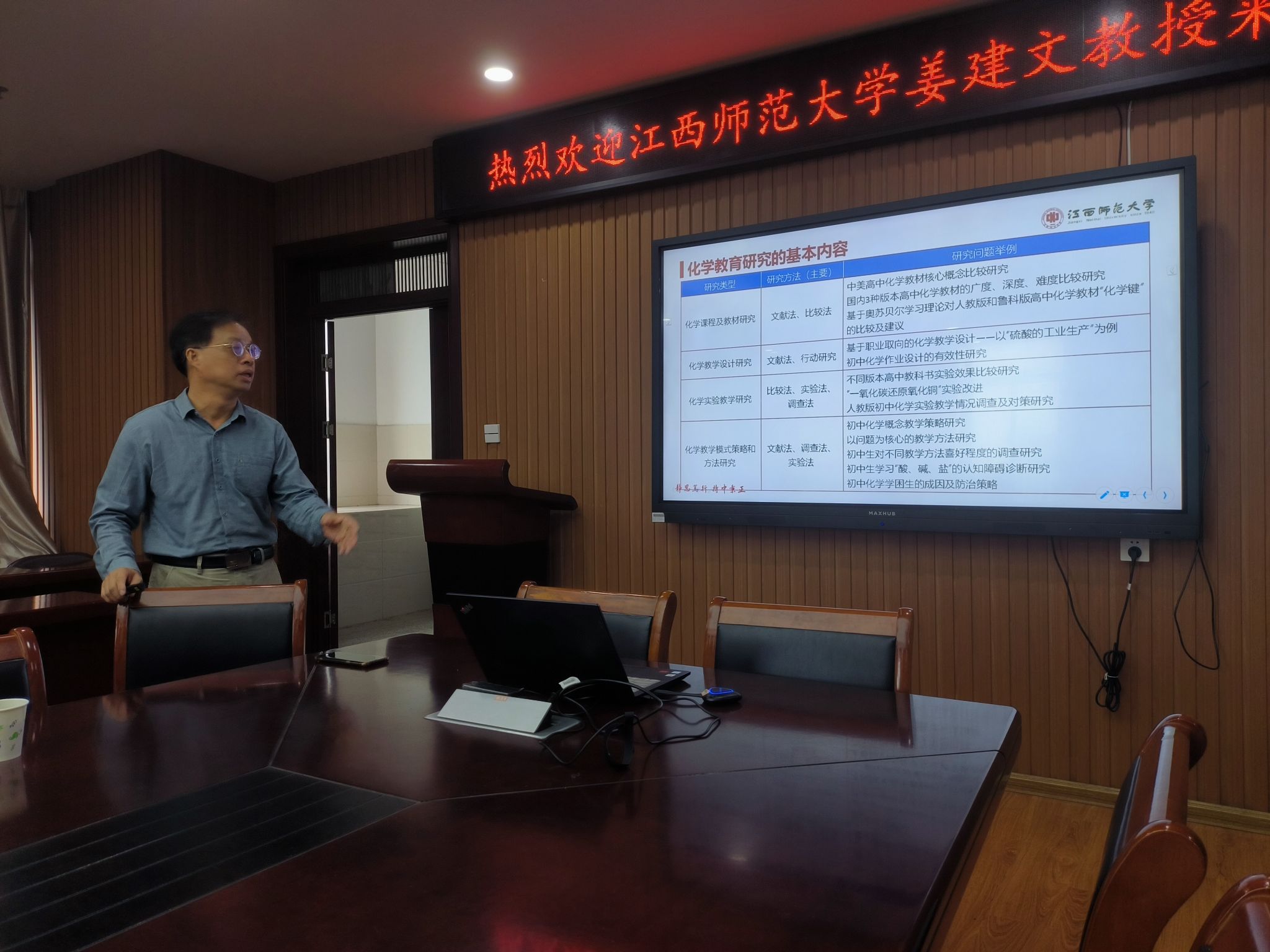 姜建文教授围绕“教学研究成果凝练的视角与方法”为主题,首先从道德情怀、家国情怀、敬业情怀、教学情怀、学术情怀五大方面介绍了教育情怀,引用苏霍姆林斯基、裴新宁、李定仁等前辈之言解释何为教学研究,随后,从化学课程及教材研究、化学教学设计研究、化学实验教学研究、化学教学模式策略和方法研究等四个方面重点阐述化学教育研究的基本内容。最后,姜教授提出三点启示:教而不研,则浅;研而不教,则空;教研不发,则囿。鼓励同学们要坚持梦想,积小胜为大胜,成功是坚持与等待的结晶!