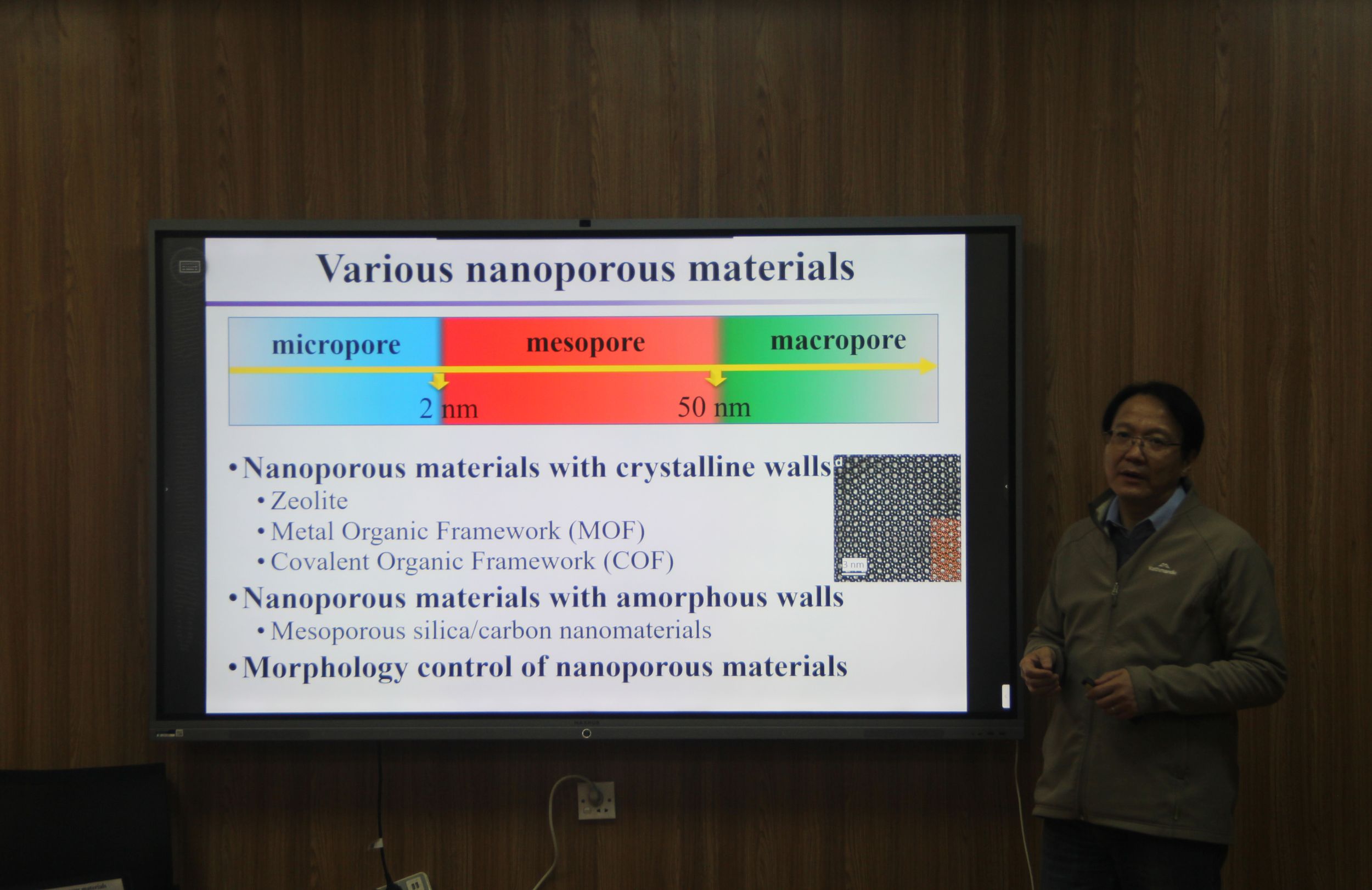 余承忠教授作了题为“Nanostructured Porous Materials”的学术报告。余教授讲解了多孔材料的制备方法以及对多孔材料的功能研究;介绍了具有结晶壁的纳米多孔材料比如沸石、金属有机骨架(MOF)、共价有机骨架(COF)等。以及生物材料的制备科学及其功能研究并且介绍了溶胶-凝胶化学及杂化材料的自组装。余教授最后介绍了介孔二氧化硅材料,介孔二氧化硅具有高表面积、孔径可调、功能表面、良好的生物相容性等优点有利于其发展。会后,余承忠教授与参会师生展开了一系列学术讨论,并回答了与会师生提出的问题。