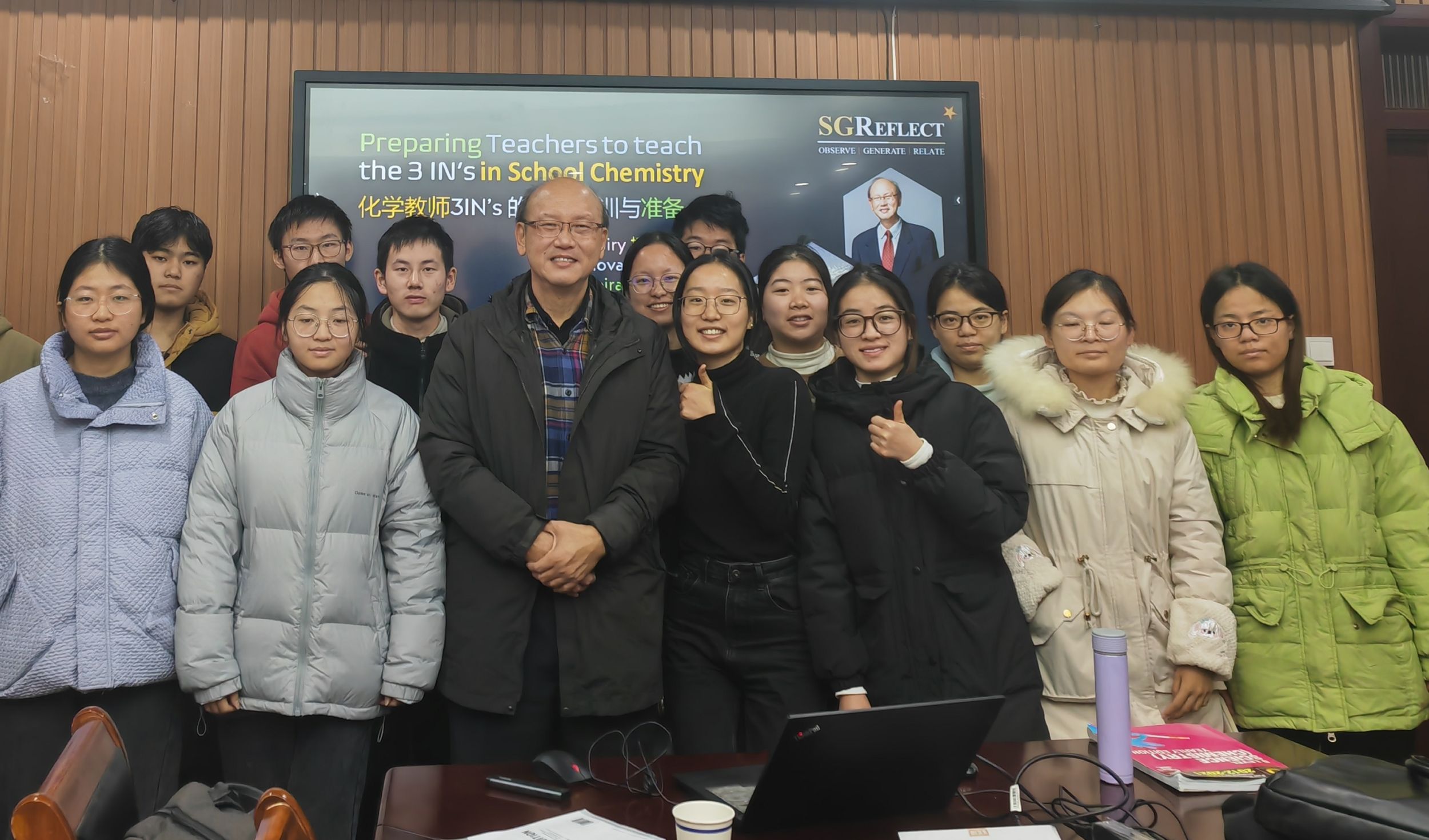 陈国祥老师以一个巧妙的科学实验开启此次活动,通过计算水从杯子流出的速率展开讨论,追问过程发人深思。陈老师首先介绍了新加坡教育体系、教学和课程框架,强调批判性、适应性、创造性思维的重要性,对The 3IN’S的内涵即Inquiry(探究)、Innovation(创新)、Inspiration(灵感)进行案例阐释。随后,陈老师对新加坡高中三个“源流”的教育和中学化学主题进行了展示和讲解,新加坡对科学和化学教师的培养,引起同学们的广泛思考。最后,陈老师总结3IN’S教学法强调发散性学习和深度思考,要求教师合理进行追问,做好知识迁移,并将情感教育融入科学教育中。陈国祥老师的讲座案例丰富、深入浅出、妙趣横生、富于哲理。讲座结束后同学们纷纷与陈老师合影留念,并与陈老师提问互动交流,受益匪浅。