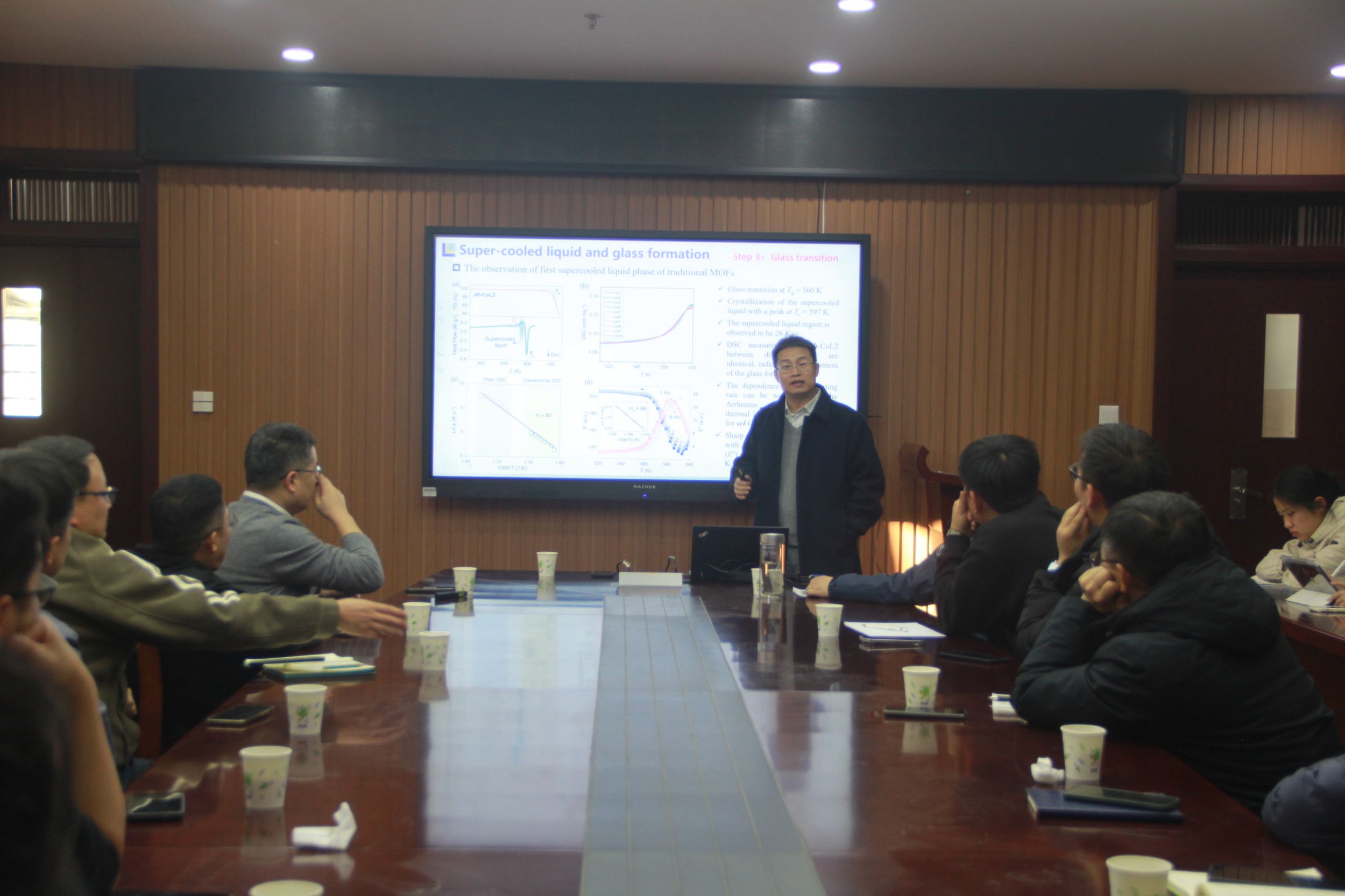 曾明华教授作了题为“涵盖晶态、液态、玻璃态的MOF多相态演变:新层次上的动态化学”的学术报告。曾教授首先介绍了关于MOF玻璃的相关研究背景,讲解了MOF玻璃的新材料与传统玻璃的比较和合成MOF玻璃的相关思路,如反应现场分步连续扰动以及金属节点、有机连接体、孔隙和脆性之间的变形传递。随后讲解了多相态MOF演变的研究探索过程。包括序贯微扰对互穿网络框架的MOF玻璃;基于序贯摄动的多相演化,其相位演化层次,如从有序到有序,有序到无序,无序到无序,无序到有序。曾教授还讲述了关于MOFs相变过程中的记忆效应等。会后,曾明华教授与参会师生展开了一系列学术讨论,并回答了参会师生提出的问题。