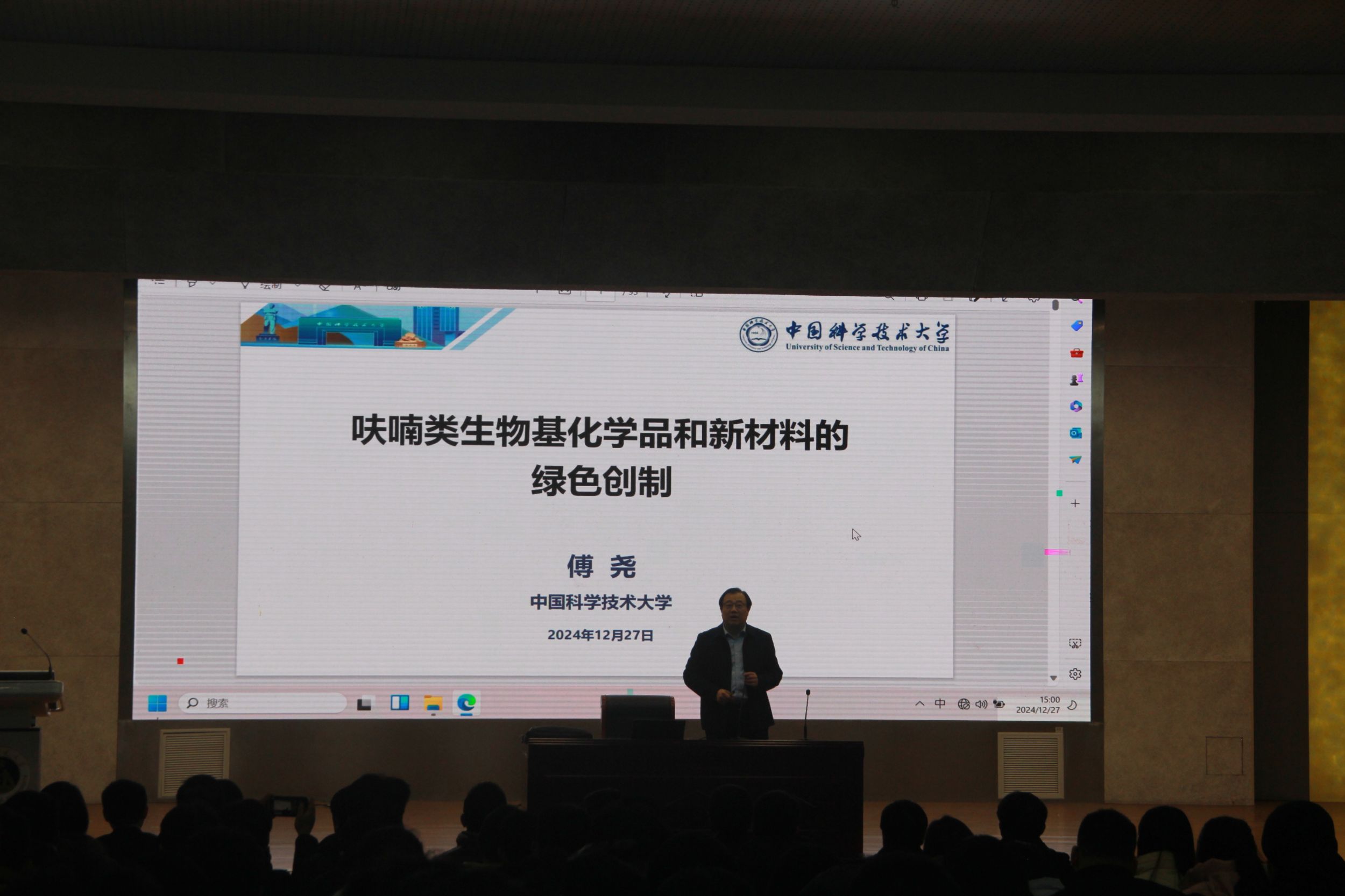 傅尧教授作了题为“呋喃类生物基新材料的绿色创制”的学术报告。傅尧教授从木质纤维素绿色催化转化、呋喃基化学品和单体合成、呋喃类生物基新材料创制等三个方面介绍了自己的研究成果。在绿色合成化学方面,傅教授致力于开发新的绿色反应和催化体系,以减少有害化学物质的使用,提高反应效率和产物选择性。傅教授的研究在生物质资源转化、废弃物处理等方面取得了显著成果,为实现可持续化学工业发展提供了新的思路和方法。会后,傅尧教授与与会师生展开了一系列学术讨论,并回答了与会师生提出的问题。