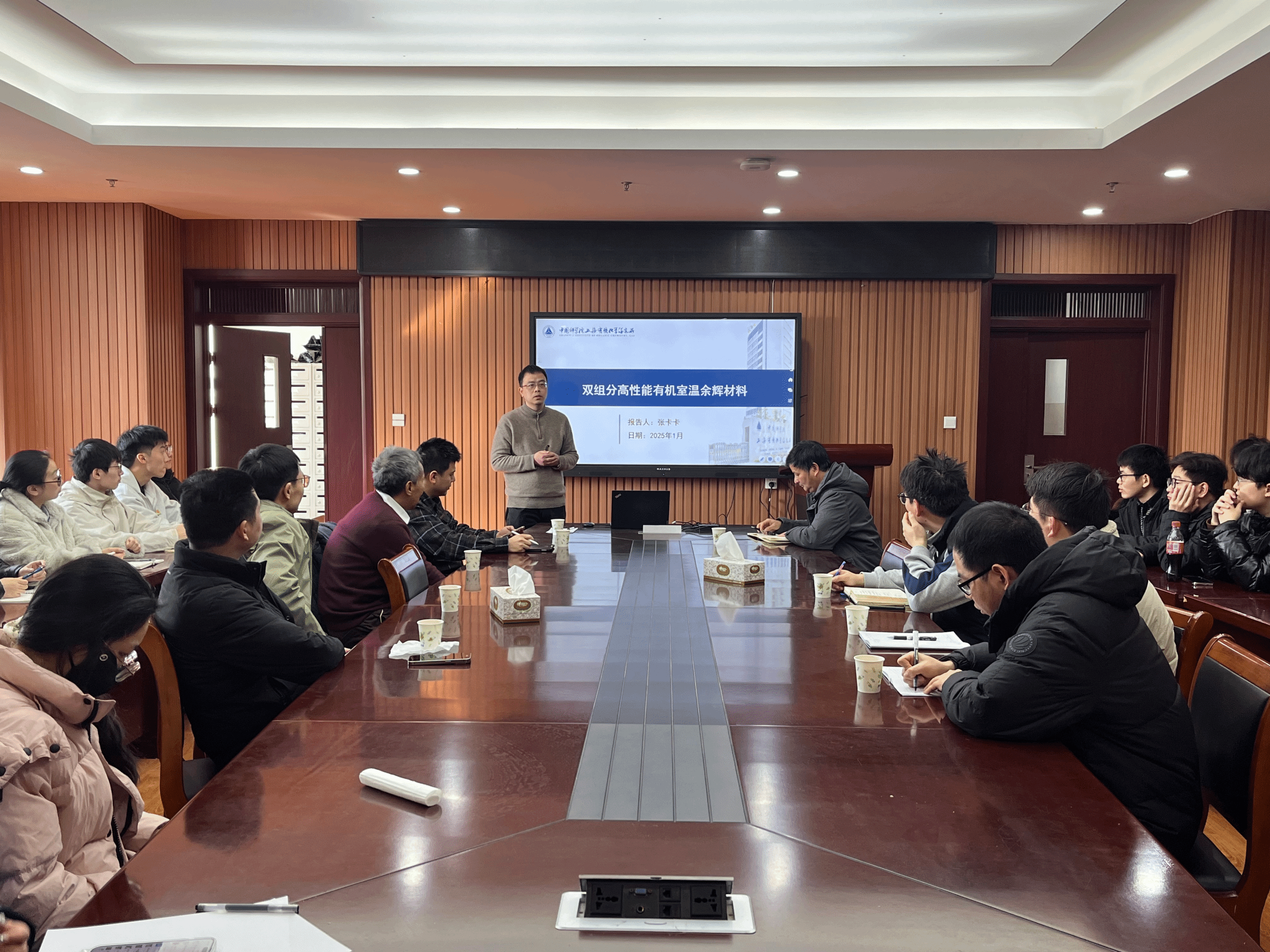 张卡卡研究员作了题为“双组分高性能有机室温余辉材料”的学术报告。张卡卡研究员首先介绍了一种新型双机理构建的高效长持续有机余辉体系,通过结合热激活延迟荧光(TADF)与磷光发射机制,成功提升了有机室温磷光材料的发光效率与稳定性。这一研究有效解决了传统材料中三线态激发态易失活的问题,显著延长了余辉时间。随后张研究员重点介绍了研究团队通过接力合成法合成了二氟硼-苯并二氮杂茂(BF₂bdk)分子,并将其应用于双组分余辉体系中。二氟硼基团的引入不仅增强了热激活延迟荧光效应,还稳定了三线态激发态,推动了两种发光机制的协同作用,提供了长时间的发光持续性。最后,张卡卡研究员介绍了这一创新体系在多个领域的广泛应用,包括化学检测、余辉涂料、余辉胶水、余辉弹性体和余辉透明木材等。材料不仅提高了发光效率,还增强了其在各种环境下的稳定性,满足了对持续发光的需求,广泛适用于安全标志、应急照明和智能传感器等领域。会后,张卡卡研究员与参会师生就报告内容展开了一系列讨论,并回答了与会师生提出的问题。