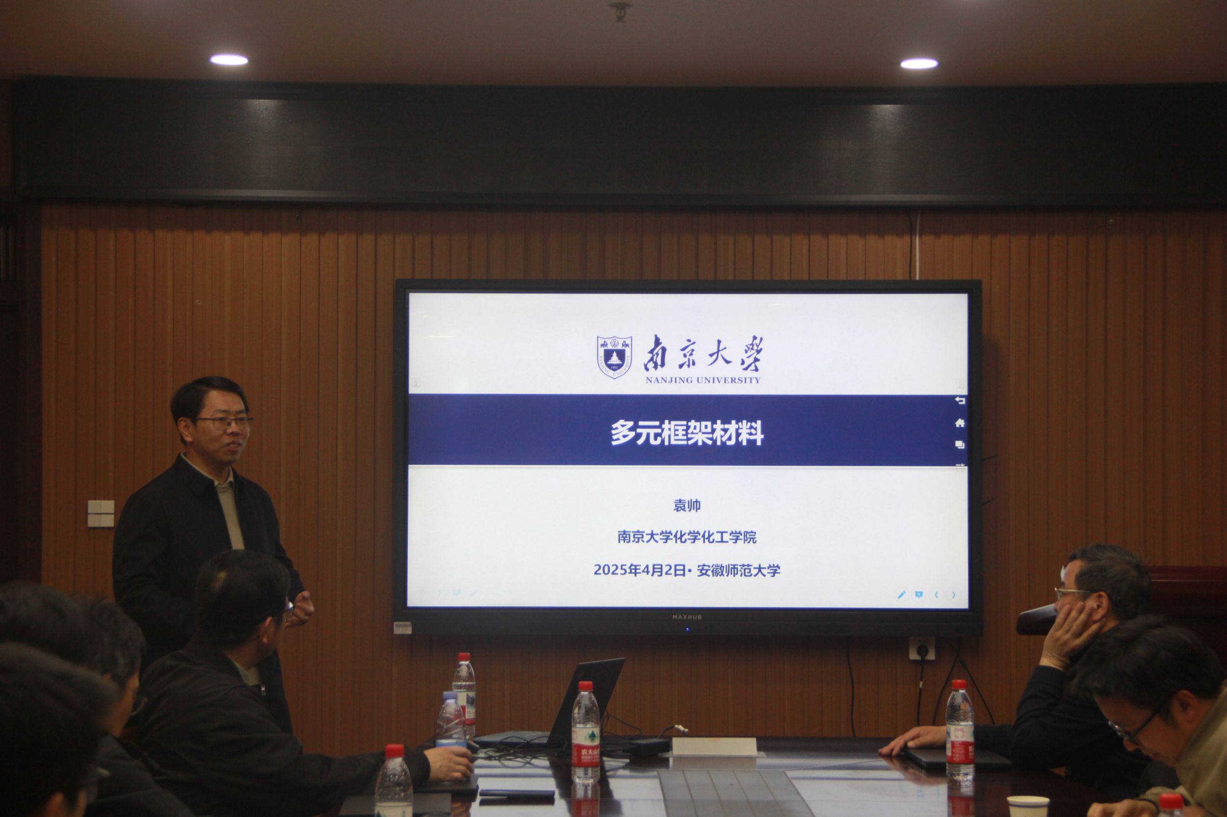 袁帅教授作了题为“多元金属有机框架材料”的学术报告。袁教授首先阐述了多元框架材料在催化领域的独特优势,指出多金属位点的协同效应可显著提升催化性能。针对传统材料难以兼顾稳定性与有序性的关键难题,团队创新性地提出"逐级动力学控制合成"策略。该方法通过精确调控反应动力学,成功实现了稳定多元有序框架的可控制备,并能在合成过程中原位负载仿酶催化剂。在研究成果展示环节,袁教授从三个方面展开论述:一是多元金属有机框架的有序合成,二是功能性共价有机框架的可控构筑,三是框架复合材料的精准制备。每个部分都结合详实的实验数据和表征结果,深入浅出地阐明了动力学控制在材料合成中的关键作用。报告结束后,袁教授与在场师生就材料表征技术、催化机理等专业问题进行了深入交流,现场讨论气氛热烈。