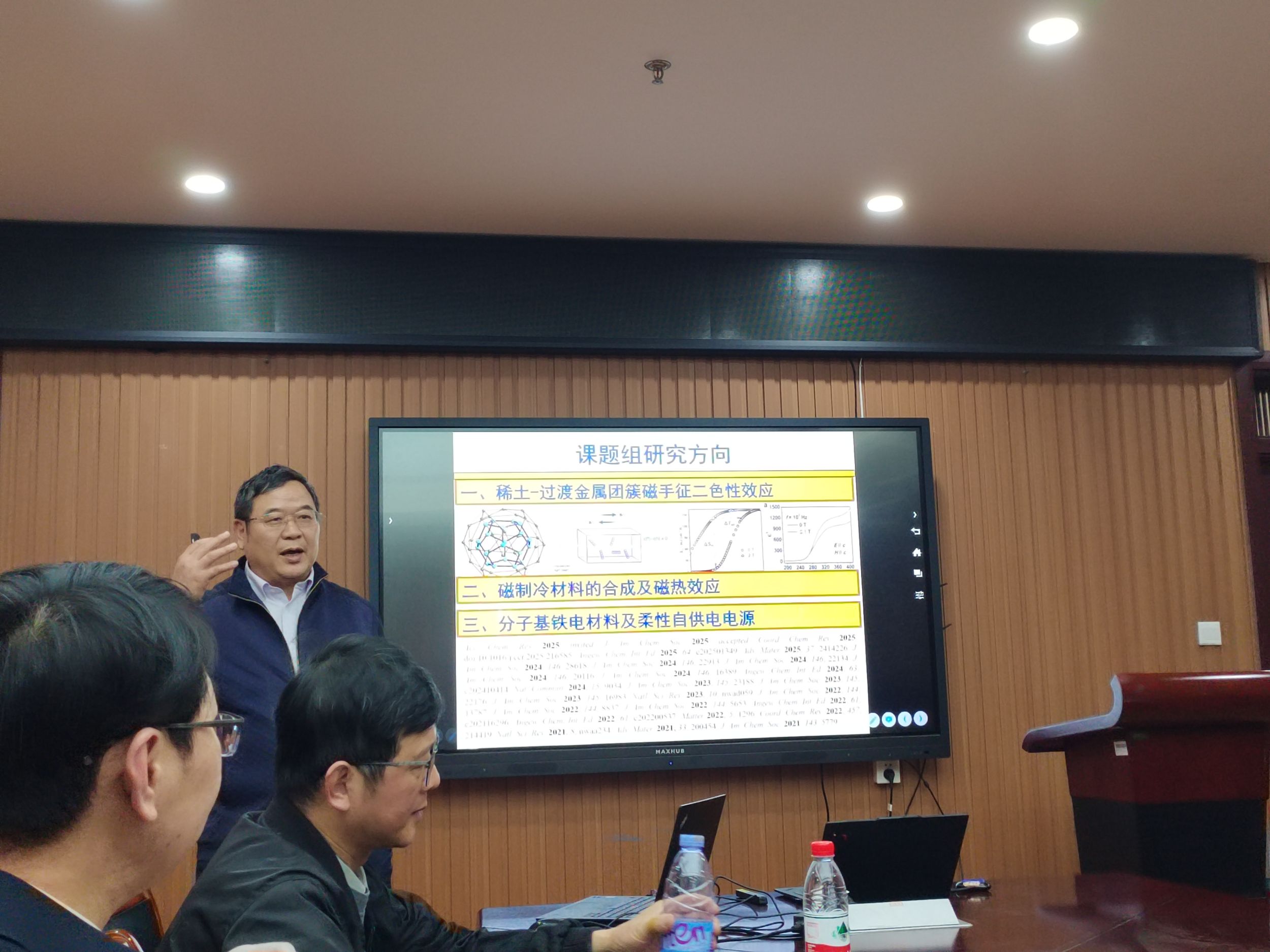 龙腊生教授围绕《超低温磁制冷材料,从合成到应用》主题展开报告。磁制冷技术,因其环境友好及高效节能等特点,一直是材料、能源等领域热点和前沿课题。然而,大规模的磁制冷材料的应用仍然面临着极大的挑战。龙教授介绍了超低温磁性制冷剂研究中的关键科学问题,以及1-4K磁性制冷剂的研究思路。他指出基于磁热效应的影响因素,要获得大磁熵的高核稀土及稀土过渡金属簇合物,就是要建立合成高核稀土及稀土-过渡金属簇合物的有效方法,并调控高核稀土及稀土-过渡金属簇合物中金属间的磁交换作用。龙教授还展示了磁制冷材料在航天器低温冷却系统、超导磁体、量子计算设备等领域的产业化前景。会后,龙腊生教授与在场师生积极互动,回答了师生们的问题。