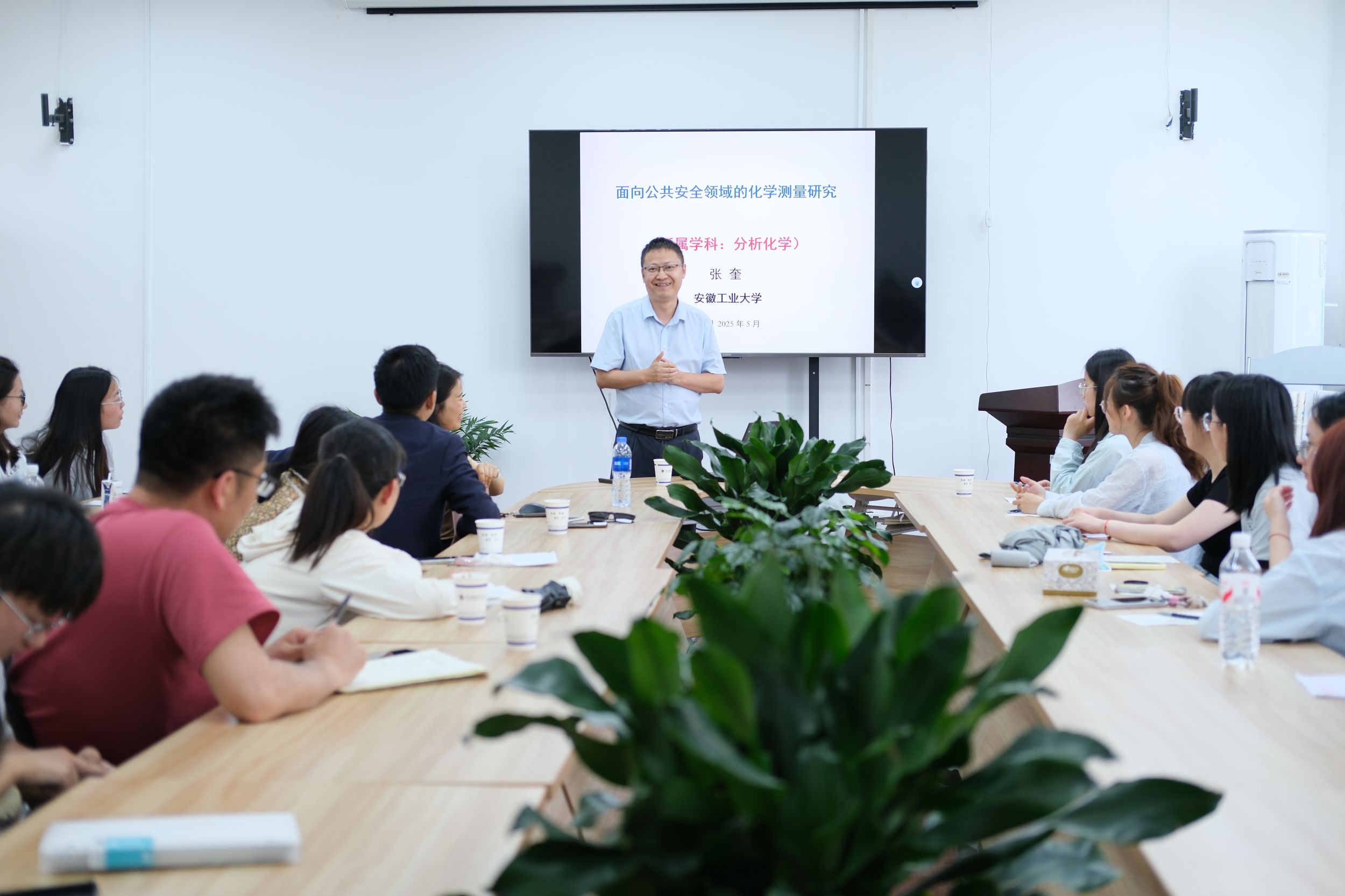张奎教授作了题为“面向公共安全领域的化学测量研究”的学术报告。张奎教授首先介绍了课题组研究工作背景,指出公共安全化学测量关系到国家安全与社会稳定,是当前亟需突破的关键方向。随后,他详细阐述了公共安全化学测量的发展方向与核心科学问题,强调光学探针在快速检测中起到“眼睛”的作用。围绕“如何实现化学探针的快速检测技术”,张教授提出了系统的研究思路。在具体工作方面,课题组致力于拓宽重构探针的检测灵敏度和浓度检测范围,发展了具有检测、吸附与去除三重功能的纳米探针,实现了铀酰的快速可视化检测。同时,团队还通过聚合物负载荧光探针,结合静电纺丝技术,以聚乙烯吡咯烷酮为基质,成功制备了纳米纤维检测试剂条,可在0–10 ppm的低浓度范围内实现快速识别,并对气相神经毒剂模拟剂实现低至5 ppm的特异性快速检测。此外,课题组还开发了基于血红蛋白抑制超氧自由基与空穴诱导机制的长余辉纳米棒颗粒,用于血迹追踪中的光漂白技术研究,展现出在公共安全检测中的广阔应用前景。会后,张奎教授与参会师生就报告内容展开了一系列讨论,并回答了与会师生提出的问题。