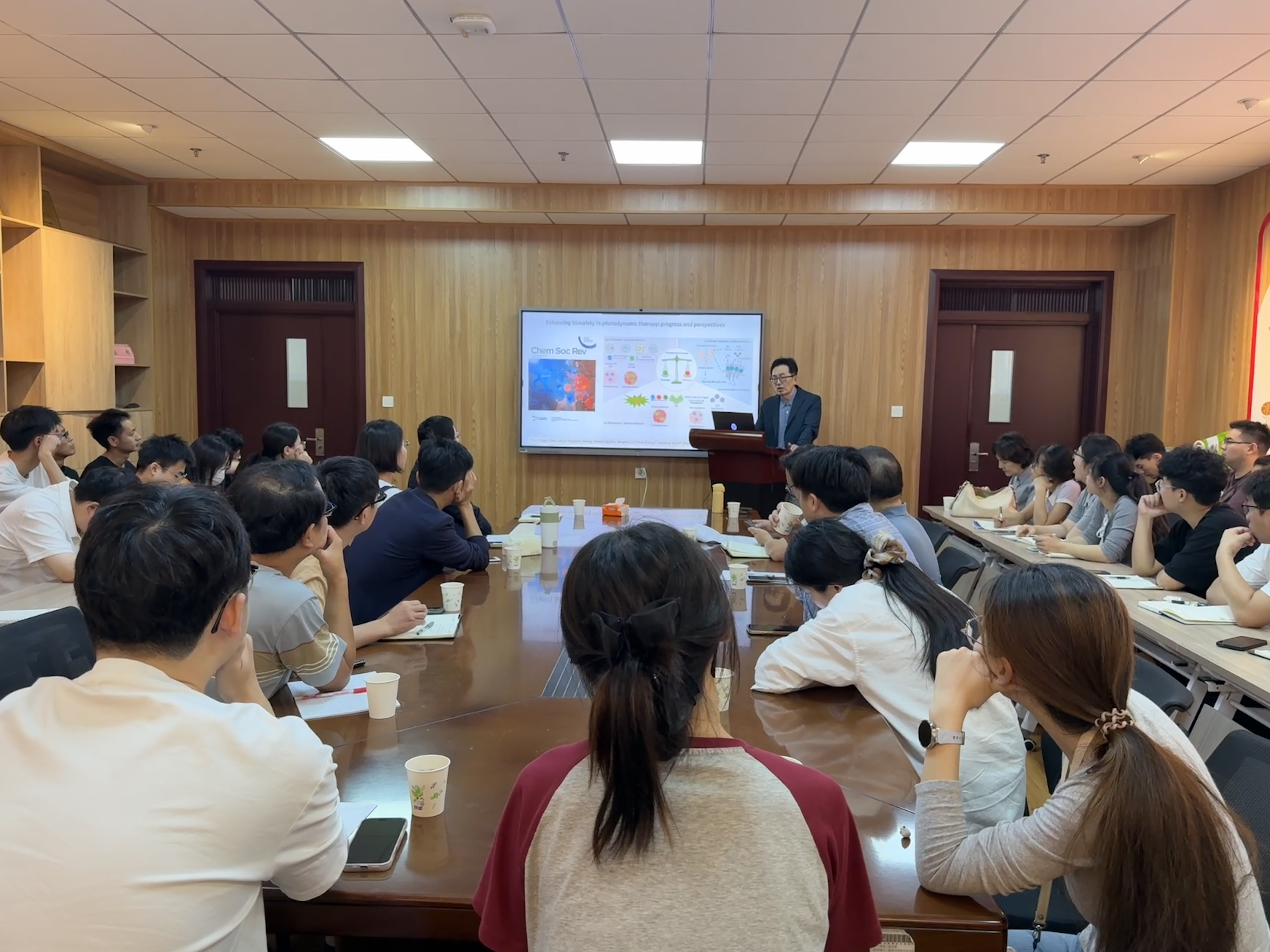 Juyoung Yoon教授以《Recent Progress on Fluorescent Imaging Probes and Phototherapy》主题展开报告,他详细介绍了荧光探针、光动力治疗和光热治疗方面的重要进展,分享了他们在新型荧光成像探针、智能光疗纳米材料领域的创新成果,重点阐述了如何通过分子设计与纳米技术构建高选择性、高灵敏度的成像探针,并探讨了光动力治疗与光热治疗在癌症精准诊疗中的应用前景与挑战。Yoon教授还分享了其团队在小动物模型中实现原位肝肿瘤靶向成像与治疗的成功案例,展示了荧光成像与光疗融合技术在疾病早期诊断与个性化治疗中的巨大潜力。最后,他展望了人工智能辅助分子设计、超分子自组装纳米药物等未来方向,强调多学科交叉在推动精准医学发展中的关键作用。报告结束后,Juyoung Yoon教授与现场师生就荧光探针等热点问题展开深入探讨。本次学术报告极大地拓宽了师生们的国际学术视野,增进了大家对荧光探针领域的深入了解。