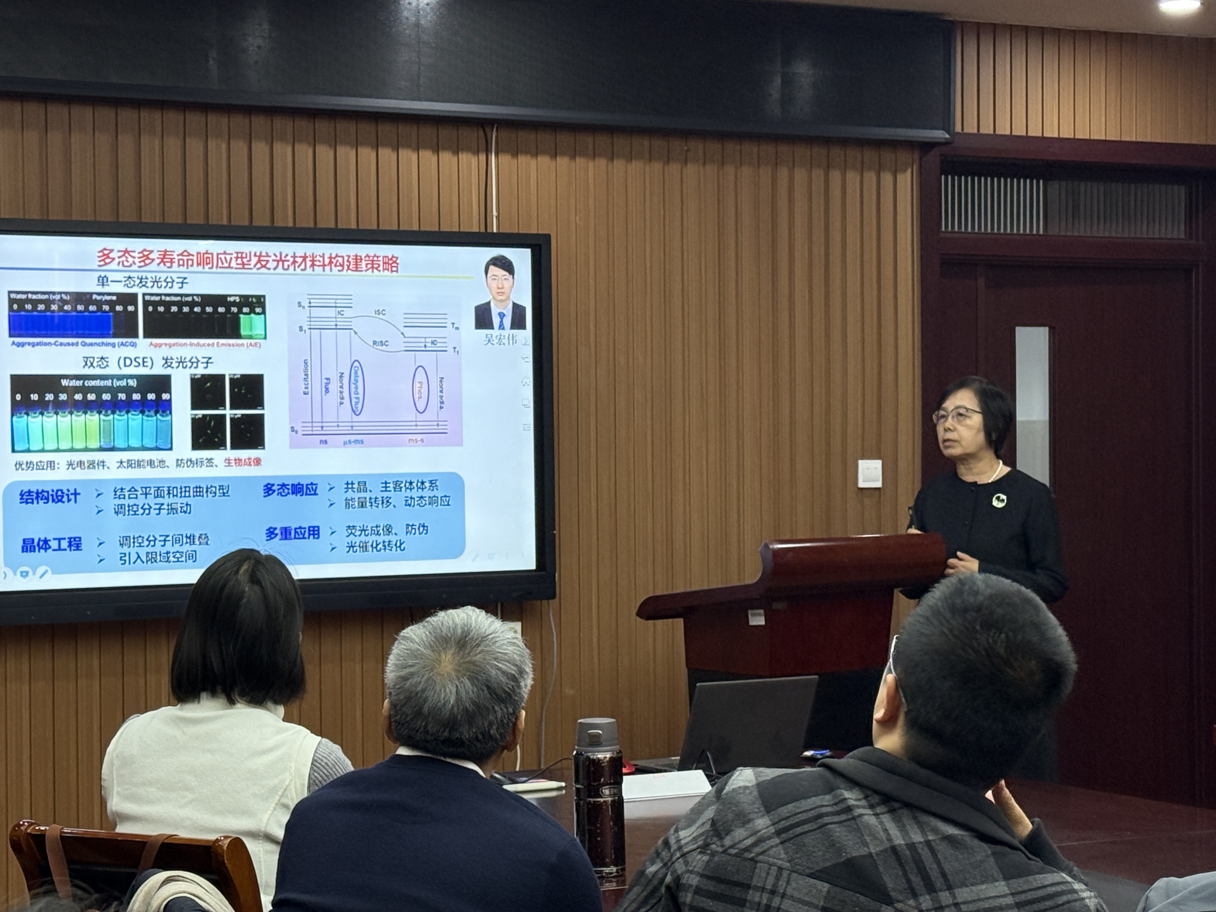 易涛教授作了题为“响应型荧光材料和激活型诊疗体系”的学术报告。易教授讲解了响应型荧光材料的应用场景涵盖生物成像、传感、发光器件、智能穿戴等,这类材料可通过调控分子振动实现双三线态参与发光,在溶液、晶体、薄膜态呈现显著不同的发光性能,其中近红外多态多寿命材料能响应细胞粘度变化,可用于细胞成像;同时介绍了模拟植物光合过程的光捕获体系,通过配位键组装金属大环,实现“多个光敏剂向一个受体”的连续能量转移,依托AIE大环稳定供能、结构匹配的优势,有效提升能量传递效率,此外还提及MOF×COF框架材料可作为催化剂,用于产生活性氧(ROS)辅助诊疗。在激活型诊疗体系部分,易教授指出ROS是病灶区域的重要病理标志物,过量ROS会破坏细胞结构、引发氧化应激,与癌症、肝肾损伤等多种疾病密切相关,随后详细介绍了三类ROS响应的诊疗工具:LMB衍生物(无色无荧光)经ROS激活后,可转化为近红外荧光的MB分子,实现光声/光动力诊疗;半导体聚合物纳米药物通过声激活诱导铁死亡,适用于深部组织肿瘤的特异性治疗;从单一次氯酸响应急速拓展为广谱ROS响应的控释平台,可构建多功能控释体系,适配不同类型的活性氧刺激。她强调,这类激活型诊疗体系核心是针对传统药物“病灶富集少、毒副作用大”的痛点,通过病理环境(pH/ROS/酶等)响应,实现“生物靶标激活+病灶原位释药”的精准策略。最后,易教授总结了核心研究成果:通过调控分子振动、组装特性,成功获得响应型多态发光材料,可应用于防伪、成像等领域;将响应基团与药物结合,构建出疾病微环境激活的前药/纳米制剂,未来将致力于实现“特异性激活的诊疗一体化”,覆盖外场响应、荧光识别、活体示踪等多个应用场景。会后,易涛教授与参会师生展开了深入的学术讨论,并耐心回答了师生提出的各类问题。
