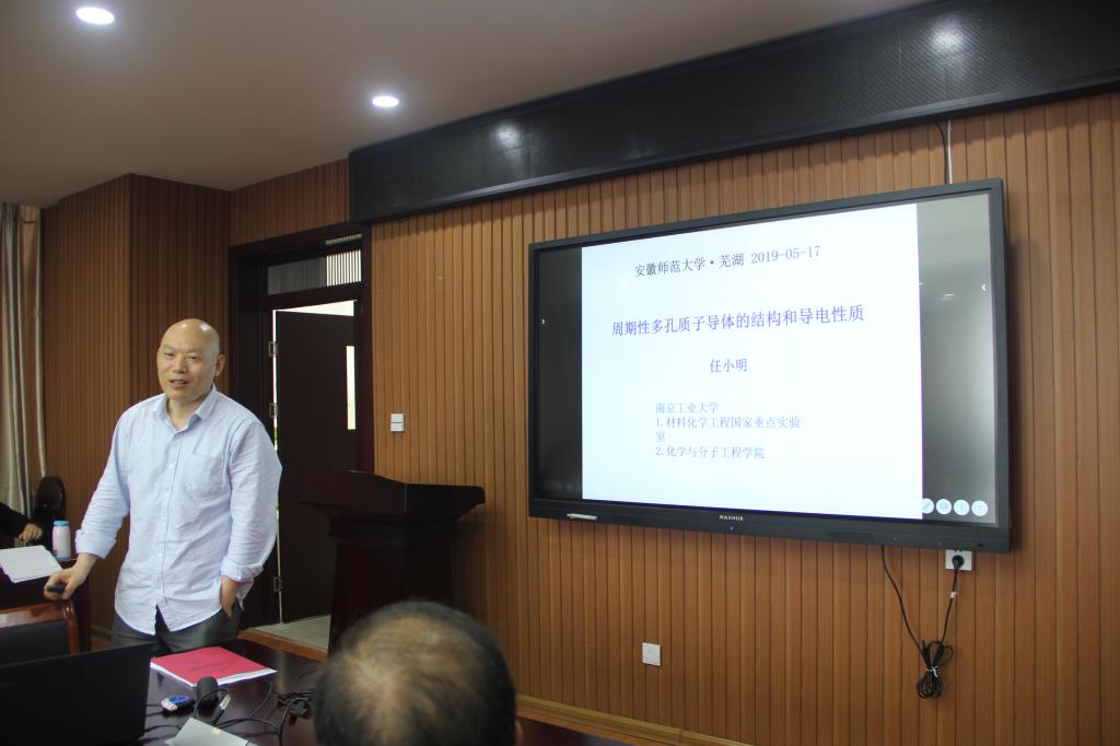 任小明教授作了题为“ 周期性多孔质子导体的结构和导电性质”的学术报告。任教授以“质子导电材料的技术应用”开题,简单介绍了固体质子导体种类:无机质子导体、有机高分子质子导体、炭基质子导体、周期性多孔质子的导体。随后着重从下述三个方面具体阐述了质子导体,首先是开骨架金属硫簇质子导体,包括(C2N2H10)(C2N2H9)2Cu8Sn3S12、H3PO4@(C2N2H10)(C2N2H9)2Cu8Sn3S12、(CH3NH3)2Ag4Sn3S8、HCl@(CH3NH3)2Ag4Sn3S8等。其次是开骨架磷酸盐质子导体,包括(C2N2H10)0.5CoPO4、(NH4)0.59(H3O)1.41Mn5(HPO3)6等。再次是Zr-MOFs质子导体,包括MOF-808&Im@MOF-808、MOF-801、MOF-802&Im@MOF-802等。最后做出总结:开骨架金属硫簇质子导体高热稳定性、高质子电导率等,开骨架磷酸盐质子导体高热稳定性、较高质子电导率等,Zr-MOFs质子导体较高温度下,大孔MOF易失水,导致电导率下降等以及多孔质子导电材料面临高温失水、纳米化、低功率密度等问题。会后任教授与与会师生进行了交流互动,与会师生掌声不息。