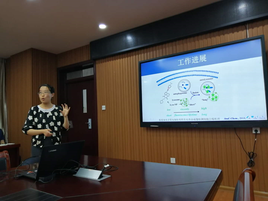 冯燕副教授作了题为“微环境双分子荧光探针可视化研究细胞自噬”的学术报告。细胞自噬是一种非常重要的细胞代谢途径,在肿瘤、帕金森等疾病过程中扮演了重要角色。传统的自噬监测方法大都从生物的角度出发,通过监测在自噬过程中特定蛋白的表达或者观察亚细胞器的形态实现,操作方法复杂而且难以在活细胞内实现高效监测。在细胞自噬过程中,自噬体(autophagosome)与溶酶体(lysosome)发生融合, 由于自噬体和溶酶体内极性的显著差异而导致在膜融合过程中,溶酶体的极性会发生变化。基于此,冯老师所在研究团队以“溶剂致变色”荧光团香豆素为母体,设计了一种溶酶体定位的小分子双光子荧光探针,实现了溶酶体极性变化的高灵敏度实时原位检测,并以此为基础构建了通过检测自噬过程中溶酶体极性变化来实现对活细胞自噬的高效荧光监测。该工作从化学角度出发,为监测细胞自噬过程提供了一种新思路。报告的最后,冯燕老师与座师生进行了热烈互动,细致耐心地回答了多个问题,参加报告的师生均受益匪浅。