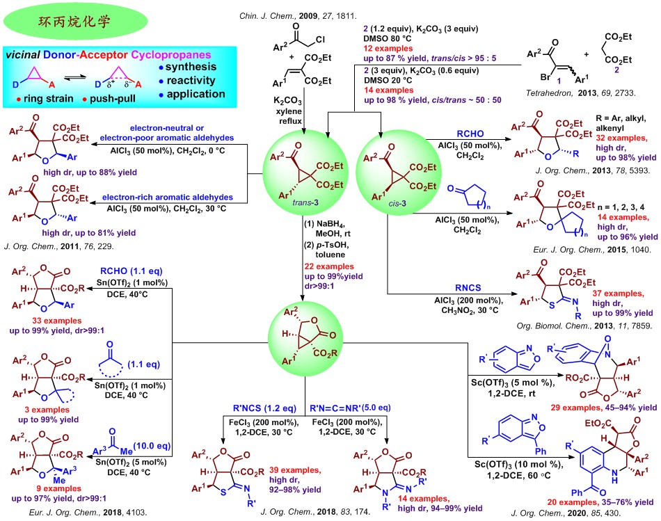 代表性论文 36. Xuelian Huang, Gaosheng Yang* and Zhuo Chai*, “Diastereoselective synthesis of benzazocines by Zn(OTf)2-catalyzed (4+4) cyclocondensation of multisubstituted donor–acceptor cyclopropanes with anthranils”, Chem. Commun. 2025, 61, 3704–3707. 35. Junqiang Jiao, Gaosheng Yang*, “Preparation of α-(Di(alkoxycarbonyl)methyl)chalcones and Their Application in the Synthesis of Multisubstituted Cyclopropanes”, Chin. J. Org. Chem. 2025, 45, 2586–2599. (焦俊强, 杨高升*, “α-[二(烷氧羰基)甲基]查尔酮的制备及其在多取代环丙烷衍生物合成中的应用”, 有机化学, 2025, 45, 2586–2599.) 34. Dongcheng Zheng, Rui Zhang, Wenlong Chen, Pengfei Yang, Gaosheng Yang* and Zhuo Chai, “Lewis Acid-Catalyzed Annulations of geminally-Disubstituted Cyclopropanes with Aldehydes or 1,3,5-Triazinanes”, Org. Lett. 2023, 25, 2577–2581. 33. Wenlong Chen, Huimin Li, Pengfei Yang, Dongcheng Zheng, Gaosheng Yang*, “Reaction of 2-Aroylmethylenemalonates with Corey Ylide”, Chin. J. Org. Chem. 2023, 43, 1472–1482. (陈文龙, 李慧敏, 杨鹏飞, 郑东程, 杨高升*, “2-芳甲酰基甲亚基丙二酸酯与Corey叶立德的反应”, 有机化学, 2023, 43, 1472–1482.) 32. Jinsong Hou, Gaosheng Yang*, “Reaction of Tandem Addition of Aliphatic Amines to Alkenylnitriles Catalyzed by Tris(o-dimethylaminobenzyl)yttrium”, Chin, J. Org. Chem. 2022, 42, 2070–2078.(侯金松, 杨高升*, “三(邻二甲胺基苄基)钇催化脂肪胺对烯腈的插入串联反应”, 有机化学, 2022, 42, 2070–2078.) 31. Jinsong Hou, Gaosheng Yang* and Zhuo Chai, “Lanthanide-Catalyzed Tandem Addition of Amines to Cyanoalkenes: Synthesis of Cyclic Amidines”, J. Org. Chem. 2022, 87, 453–463. 30. Peiying Su, Huimin Li, Wenlong Chen, Gen Luo, Gaosheng Yang* and Zhuo Chai, “Lewis Acid Catalyzed [3+2] Annulations of γ-Butyrolactam-Fused Donor–Acceptor Cyclopropanes with Aromatic Aldehydes and Aldimines”, Eur. J. Org. Chem. 2020, 5380–5387. 29. Xingyu Zhang, Manli Feng, Gaosheng Yang* and Zhuo Chai, “Sc(OTf)3-Catalyzed Chemodivergent Annulations of γ-Butyrolactone-Fused Cyclopropanes with Anthranils”, J. Org. Chem. 2020, 85, 430–440. 28. Yue Shen, Jun Chai, Gaosheng Yang*, Wenlong Chen and Zhuo Chai, “Stereocontrolled Synthesis of trans/cis-2,3-Disubstituted Cyclopropane 1,1-Diesters and Applications in the Syntheses of Furanolignans”, J. Org. Chem. 2018, 83, 12549–12558. 27. Pengfei Yang, Yue Shen, Manli Feng, Gaosheng Yang* and Zhuo Chai, “Lewis Acid Catalyzed [3+2] Annulation of γ-Butyrolactone Fused Cyclopropane with Aldehydes/Ketones”, Eur. J. Org. Chem. 2018, 4103–4112. 26. Yue Shen, Pengfei Yang, Gaosheng Yang*, Wenlong Chen, Zhuo Chai, “Lewis acid-catalyzed enantiospecific [3 + 2] annulations of γ-butyrolactone fused cyclopropanes with aromatic aldehydes: synthesis of chiral furanolignans”, Org. Biomol. Chem. 2018, 16, 2688–2696. 25. Manli Feng, Pengfei Yang, Gaosheng Yang*, Wenlong Chen, Zhuo Chai, “FeCl3-Promoted [3 + 2] Annulations of γ-Butyrolactone Fused Cyclopropanes with Heterocumulenes”, J. Org. Chem. 2018, 83, 174–184. 24. Zhuo Chai, Yemei Wang, Mujun Tang, Xiaolong Mu, Jinsong Hou, Gaosheng Yang*, “Chiral rare-earth metal complexes with a tridentate amido-fluorenyl ligand: Syntheses, structures and catalytic performance”, J. Organomet. Chem. 2017, 846, 236–241. 23. Zhuo Chai, Jiang Chu, Yunyi Qi, Mujun Tang, Jinsong Hou and Gaosheng Yang*, “Half-sandwich chiral rare-earth metal complexes with linked tridentate amido-indenyl ligand: synthesis, characterization, and catalytic properties for intramolecular hydroamination”, RSC Adv. 2017, 7, 1759–1765. 22. Deju Hua, Pengfei Yang, Yue Shen, Gaosheng Yang*, Zhuo Chai*, “PCl5-mediated ring-openings of trans-2,3-disubstituted cyclopropane-1,1-diesters: A stereoselective way to trisubstituted vinyl chlorides”, Tetrahedron 2017, 73, 1205–1210. 21. Gaosheng Yang*, Tingting Wang, Jun Chai, and Zhuo Chai*, “AlCl3-Catalyzed [3+2] Annulations of cis-2,3-Disubstituted Cyclopropane 1,1-Diesters with Cyclic Ketones: Diastereoselective Construction of Spirotetrahydrofurans”, Eur. J. Org. Chem. 2015, 1040–1046. 20. Zhuo Chai, Dezhi Hua, Kui Li, Shuangliu Zhou, Jiang Chu, Gaosheng Yang*, “Rare-earth metal complexes with tridentate linked amido-indenyl ligand: Synthesis, characterization, and catalytic properties for intramolecular hydroamination”, J. Organomet. Chem. 2014, 768, 136–139. 19. Zhuo Chai, Dezhi Hua, Kui Li, Jiang Chu and Gaosheng Yang*, “A novel chiral yttrium complex with a tridentate linked amido-indenyl ligand for intramolecular hydroamination”, Chem. Commun. 2014, 50, 177–179. 18. Gaosheng Yang*, Yongxian Sun, Yue Shen, Zhuo Chai*, Shuangliu Zhou, Jiang Chu, and Jun Chai, “cis-2,3-Disubstituted Cyclopropane 1,1-Diesters in [3 + 2] Annulations with Aldehydes: Highly Diastereoselective Construction of Densely Substituted Tetrahydrofurans”, J. Org. Chem. 2013, 78, 5393–5400. 17. Yongxian Sun, Gaosheng Yang*, Zhuo Chai*, Xiaolong Mu and Jun Chai, “AlCl3-promoted [3 + 2] annulation of cis-2,3-disubstituted cyclopropane 1,1-diesters with isothiocyanates: stereoselective synthesis of densely substituted 2-iminodihydrothiophenes”, Org. Biomol. Chem. 2013, 11, 7859–7868. 16. Yongxian Sun, Gaosheng Yang*, Yue Shen, Zan Hua, Zhuo Chai*, “Stereoselective cyclopropanation of a-bromochalcone with diethyl malonate promoted by K2CO3”, Tetrahedron 2013, 69, 2733–2739. 15. Gaosheng Yang*, Chongrong Luo, Xiaolong Mu, Tingting Wang and Xin-Yuan Liu*, “Highly Efficient Enantioselective Three-Component Synthesis of 2-Amino-4H-Chromenes Catalysed by Chiral Tertiary Amine-Thioureas”, Chem. Commun. 2012, 48, 5880–5882. 14. Gaosheng Yang*, Yue Shen, Kui Li, Yongxian Sun, Yuanyuan Hua, “AlCl3-Promoted Highly Regio- and Diastereoselective [3+2]Cycloadditions of Activated Cyclopropanes and Aromatic Aldehydes: Constru