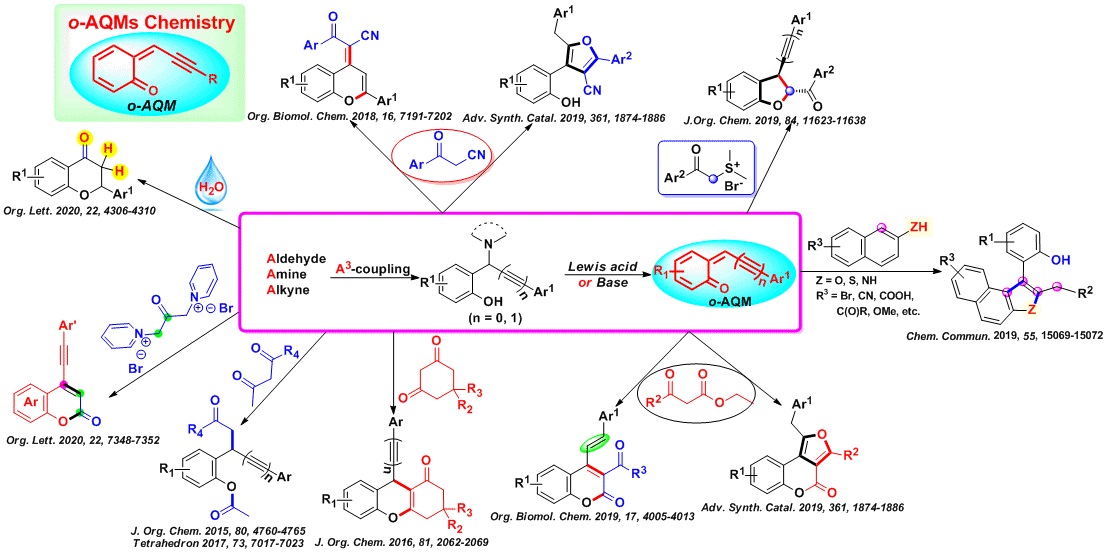 本课题组主要从事过渡金属催化的多组分串联反应和基于邻亚甲基苯醌(o-AQMs)的1,4-共轭加成/分子内环化串联反应合成杂环化合物的研究。近年来主要围绕具有多反应位点的高活性反应中间体o-AQMs的化学转化及其反应性开展相关研究,发展了其与不同亲核试剂(如2-萘酚、苯甲酰硫叶立德、α-羰基活泼亚甲基化合物等)的1,4-共轭加成/分子内环化串联新反应及多种结构新颖含氧杂环化合物的合成新方法,研究成果先后在Org. Lett., Chem. Commun., Adv. Synth. Catal., J. Org. Chem., Org. Biomol. Chem., Tetrahedron等SCI核心期刊上发表。同时在过渡金属催化的重氮化合物的C-H官能化和环加成反应等方面也开展了部分研究工作,并取得了一定研究结果。