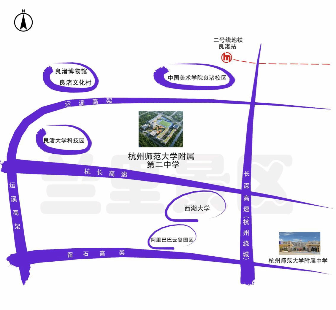 学校地处杭州市云城版块,坐拥数智云谷小镇、秀美兰里景区,南临西湖大学,北与良渚文化村接壤,地理位置优越。地铁二号线近在咫尺、交通便利,距西湖风景区、西溪湿地均约15公里。