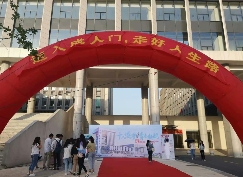理科大楼下,学院精心准备了一场迈向“成人之门”的成人礼仪式。同学们依次迈进“成人之门”,走上红毯。迈入成人门意味着他们已长大成人,在未来的道路上,将以成人的方式学习并加入社会活动,以梦为马,不负韶华,青春无问西东。鲜红的红毯则寓意着祝福他们在未来走向一条康庄大道。红毯左侧为同学们准备了成人之礼,定制书签的背面印有带着学院领导、教师代表及辅导员的殷切叮咛与美好祝愿,晶莹剔透的心愿瓶中记载着每位同学对于四年后的期盼。在红毯尽头的空白幕布,同学们走完红毯后,纷纷在幕布上进行自我青春的署名。这署名是对自我青春的担当、也是对自我庄严的宣誓。此外,学院还精心准备了人形立牌的拍照框供同学们在仪式后进行拍照留念。
