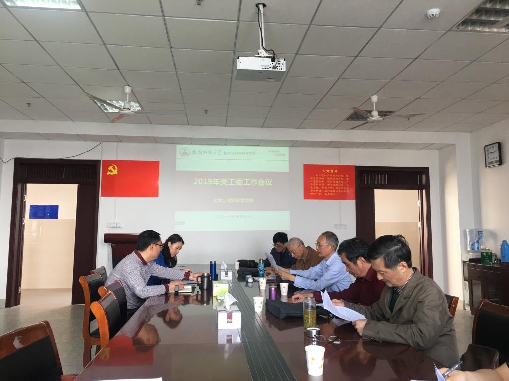陶勇)5月10日上午,化材学院在707会议室召开2019年度关工委会议,总结2018年度院关工委工作情况、并就2019年关工委工作进行了讨论和部署。院党委副书记、关工委副主任余妍霞,院关工委副主任宫世国及院关工委老同志、全体专职辅导员参加会议,会议由院党委书记、院关工委主任汪俊武主持。