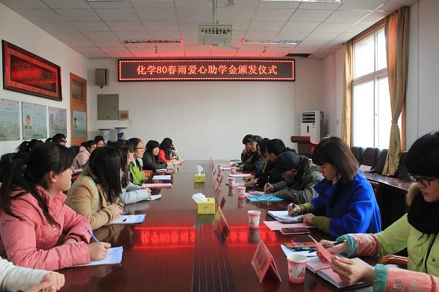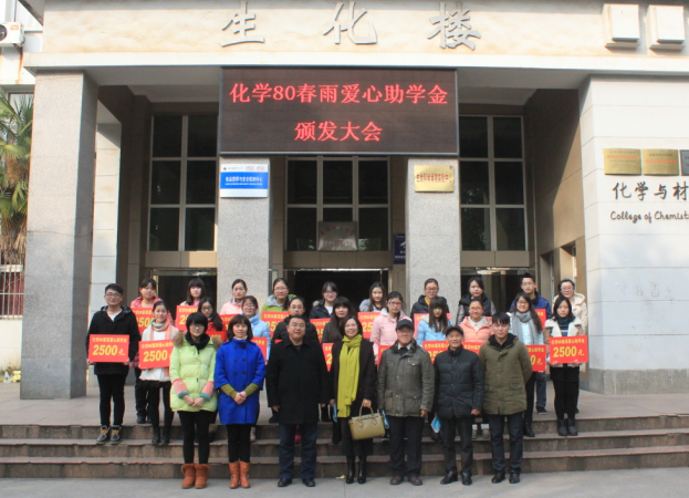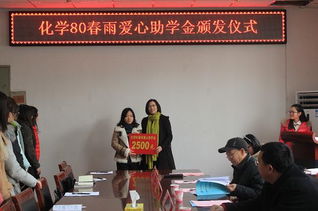 颁发仪式上,林勇女士为受助学子一一颁发了助学金,并鼓励受助学子要勇敢面对暂时的困境,勤奋学习,志存高远,将来更好地回报母校,服务社会。13级应化专业的党倩同学代表受助同学满怀深情地表达了对化学系80级校友设立的爱心助学金的感谢,表达了助学金给予自己的不仅是经济上的鼓励,更是精神上的温暖与支持,他说自己以后在生活上一定会勤俭节约,学习上更加刻苦努力,全面发展自己,让自己成为一个活泼善良的人,为社会贡献一份青春的力量。贡植斌宣读了“化学80春雨爱心助学金”的颁发决定。傅乐义和史铁杰分别表达了对学院80级校友的善心义举的感谢,对校友在各行各业取得的成绩和成功表示祝贺,并希望80级校友能一如既往地关心学院发展,为学院多提宝贵意见。同时,傅乐义和史铁杰希望受助同学要珍惜时间,刻苦学习;勤俭节约,健康快乐;学会感恩,奉献社会。