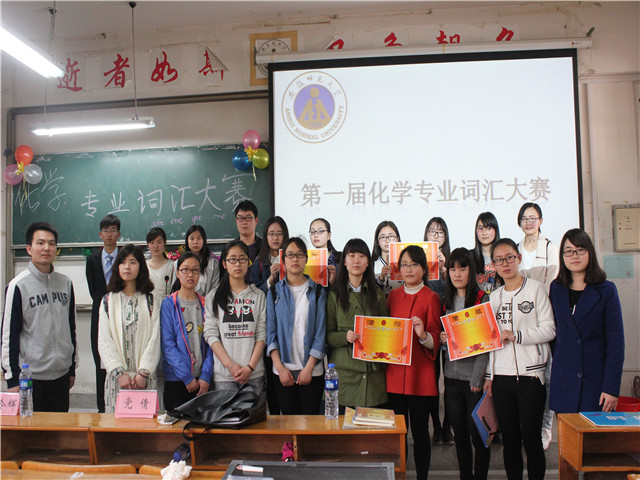 为了加强二年级本科生对专业英语的学习,学院举办首届化学专业词汇大赛。决赛采用双人三轮制。第一轮是“趣味命题”,选手根据大屏幕显示的化学式,对化学物质进行英文命名,选手们都争取在最短的时间里写出答案。激烈的比赛让现场氛围变得紧张起来,而第二轮的“你比我猜”则是引出了观众们的欢笑声,两名选手对立而站,一个人看着屏幕用手势比划出词语,而另一个人则是猜出是什么,幽默的肢体语言使现场紧张的气氛顿时减轻不少。最后一轮的“名人名记”将现场气氛推向高潮,屏幕上给出名人的相关理论,选手猜出人名,还要进行抢答,第一个抢答且答案正确将获得分数。屏幕刚换题,就有选手举起小黑板显示答案,观众们看得目瞪口呆。本次活动的成功举办,不仅锻炼了选手们对化学词汇的熟悉度,也增进了同学们对专业的深刻理解。