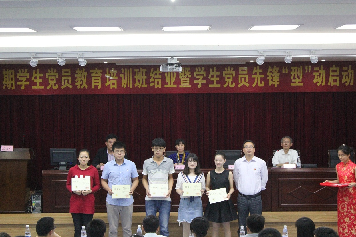 启动仪式在庄严的国歌声中拉开帷幕,学生党员代表党倩代表学员发言,她细致回顾了党员教育培训班的学习过程,重点分享了学习的收获和体会。党校指导老师胡敏宣读了校级优秀学员表彰决定。汪俊武为优秀学员颁发了荣誉证书和结业证书。为进一步强化党员身份意识,四位本科生党支部书记为学生党员代表佩戴“党徽”,发放了“党员示范床铺”铭牌。学生党员代表代表2013级化学专业汪文琴带领全体学生党员郑重宣读《党员行为准则承诺书》,承诺从身边做起,从小事做起,从自己做起,努力成为思想觉悟上的“先行者”、专业学习上的“排头兵”,班级建设上的“智囊团”,文明创建上的“领头人”,志愿服务上的“践行者”,全体党员现场签订承诺书。