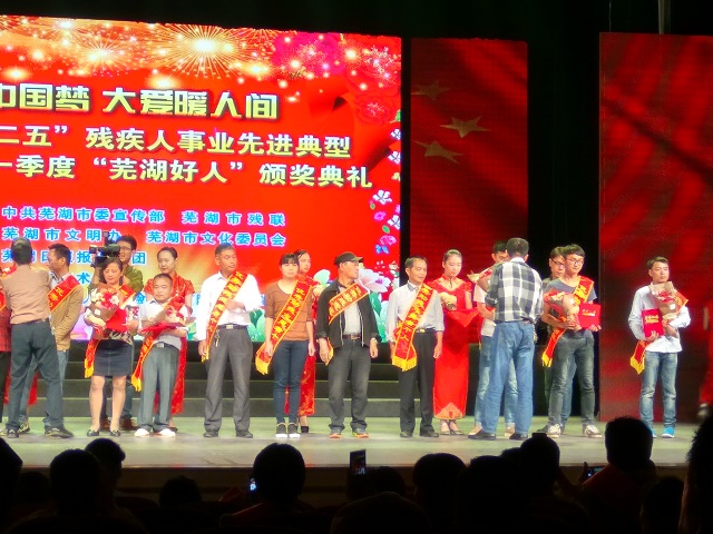 14级应用化学专业学生创建的“红烛”助残服务队获得了芜湖市“优秀助残志愿者团队”的光荣称号,队长李忠信同学作为代表上台领取了这份荣誉。