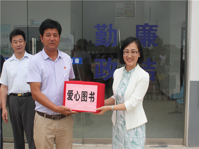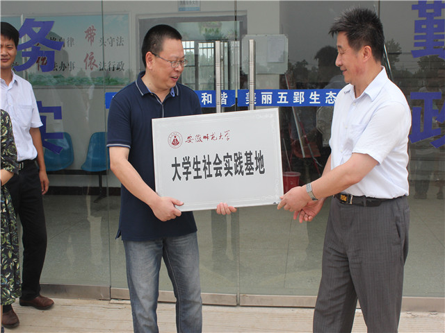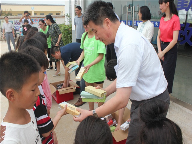 随后,程度一行参加了社会实践基地的挂牌仪式,为五郢村的孩子们送上了“三件礼物”。第一件礼物是安徽师范大学在五郢村建立大学生暑期社会实践基地,程度向怀远县副县长贾良清赠牌;第二件礼物是为五郢村留守儿童带来的爱心图书,校团委书记梁燕向五郢村赠送了爱心图书;第三件礼物为留守儿童带来的爱心文具,双方领导一起为七十余名赠送了爱心文具。收到礼物的留守儿童们一个个绽放出快乐的笑容。