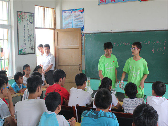 座谈会结束后,程度一行来到实践团队的活动现场看望了正在开展爱心支教活动的志愿者们,观摩了志愿者们为留守儿童演示的趣味实验,聆听了志愿者们为留守儿童们上的科普课,观看了志愿者们带领留守儿童表演的舞蹈。