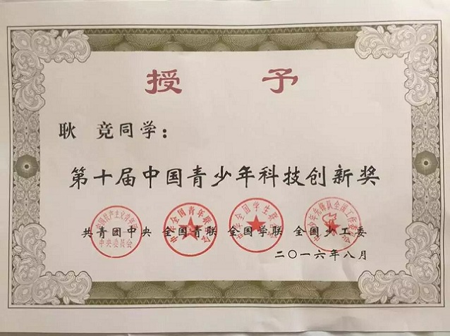 2013级学子耿竞作为安徽省唯一的本科生获奖者荣获第十届中国青少年科技创新奖,是我校继2011届本科生蒯龙同学之后,第二位获此殊荣的学生。