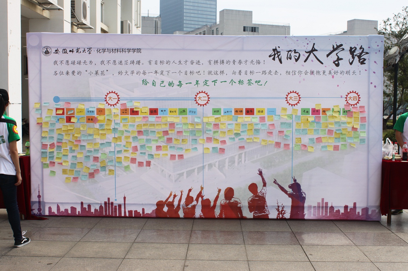 此外,学院还精心组织开展了“我的大学路”现场设计活动。在迎新志愿者指引和帮助下,2016级新生在便签纸上写下自己心中期待的大学生活,与自己设计的“大学之路”合影,以此激发新生对美好大学生活的向往,鼓舞自己努力奋斗完成自己的青春梦想。