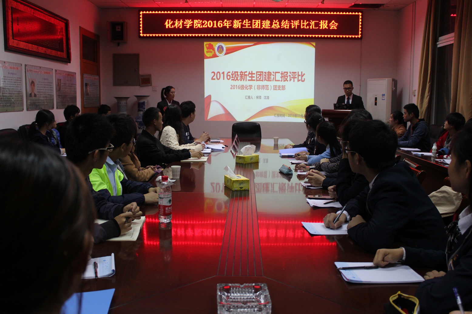 2016学年新生团建评选汇报会于生化楼大会议室隆重举行。学院团委蒋建伟老师及2016级辅导员王国良、朱珊老师受邀出席并担任评委,2016级各班级代表参加了此次汇报会。